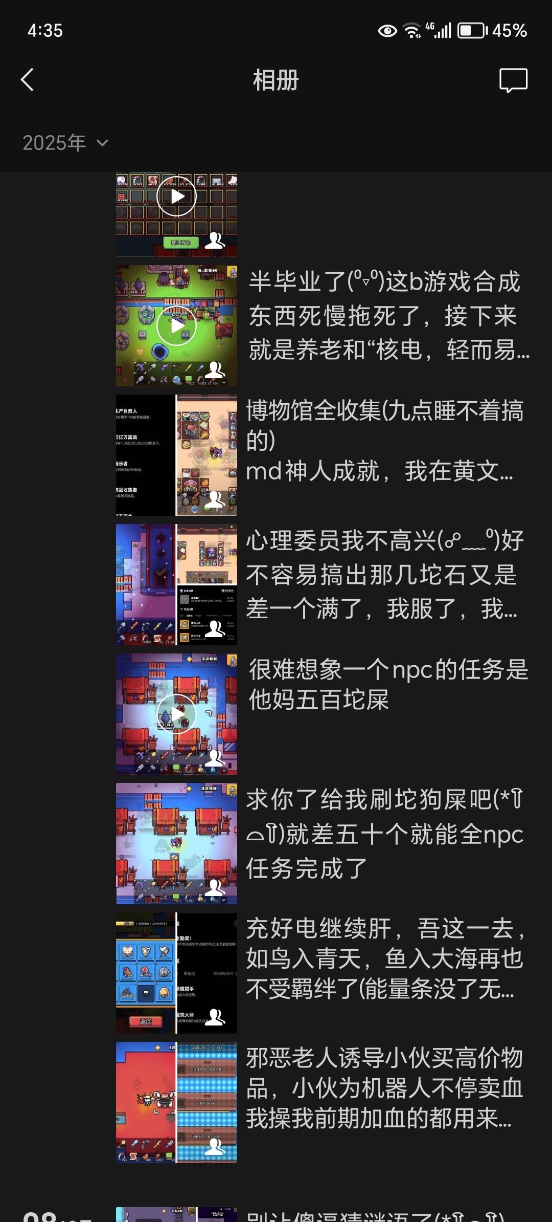 崩溃倒是没有因为全是气笑了,我第一天看的up主游玩视频没有卖血和解密的所以前期克服之证全用来升级了以至于我后来看攻略后血量一直处于一滴血,点背也是真的背要不是第二个就开出捕鱼神器我估计都玩不下去了为什么是四天才完成呢¿我银行一百万的现在刚挂出来。。。你们知道一个人通宵到八点还在商城刷便便提交任务的无能吗,我刚提交完任务商城全在卖大便( ╯▽╰)还有捕鱼陷阱的概率真的低,我最后才升级完法杖游戏