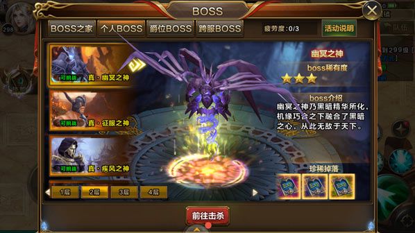 活动时间:全天参与方式:单人参与活动说明:1. 每人每天可根据疲劳度多次挑战已解锁的BOSS,同一BOSS可多次挑战;2. BOSS死亡即视为挑战成功,获得BOSS掉落奖励,并且增加1点疲劳度;3. 副本内死亡或时间耗尽即视为挑战失败,退出副本,并且不增加疲劳度;4. 当玩家疲劳度达到上限后,若存在疲劳重置次数,则可花费钻石进行疲劳度重置;5. 每日的24:00,疲劳度将会重置为0点
