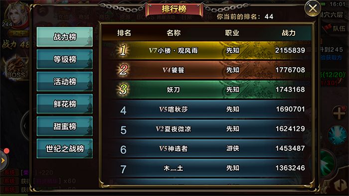 游戏中提供排行榜功能查看玩家在游戏中对应战力和系统的排行。查看排行榜的方式,点击界面上方排行榜进入排行榜界面排行榜类型排行榜目前分为战力榜、等级榜、活动榜、鲜花榜、甜蜜榜、世纪之战榜等6种榜单。每种排行榜榜单显示前100名玩家对应的信息,可上下拖动查看内容。排行榜下方可查看玩家自身在这个榜上的排名和对应信息。