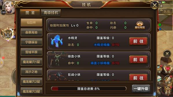 你是否还在为升级慢而烦恼?你是否还在为不知道如何获得大量的经验而烦恼?你是否还在为上班没时间玩而烦恼?今天小编就给大家带来一个既能升级又能获得大量经验的好方法。这个方法就是可以采取高级挂机的形式获得大量的经验,首先我们可以看到图鉴里面有很多小怪可以击杀的,含有仙踪林、翡翠高地、宁静溪谷、雪域平原、魔龙巢穴1层、流沙之地、魔龙巢穴2层、魔龙巢穴3层、幽暗沼泽、魔龙巢穴4层、魔龙巢穴5层、陨星盘地、