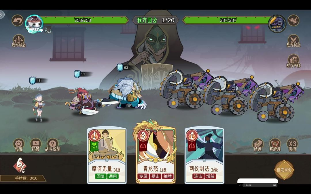 阵容在评论区 思路:在说思路之前先向大家解释下牌库和弃牌库。 下一次抽取的卡片为牌库里的牌 使用之后的卡片为弃牌库里的牌,且弃牌库下回合会回到牌库 所以思路就是。不使用其他牌,只使用[基础剑法]和[两仪剑法]。使得这两张牌一直在牌库和弃牌库里循环,使我们每回合都可以叠加[两仪剑法]的被动。依靠[两仪剑法]的被动一直叠加攻击,成功过图。[基础剑法]造成伤害同时获得一层连击。[两仪剑法]消耗一层连击获