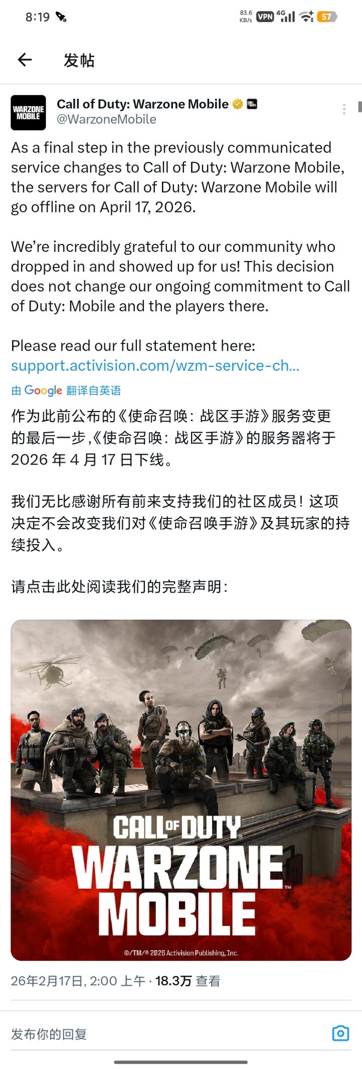 官方原文 : 作为此前公布的《使命召唤:战区手游》服务变更的最后一步,《使命召唤:战区手游》的服务器将于2026年4月17日下线。我们无比感谢所有前来支持我们的社区成员!这项决定不会改变我们对《使命召唤手游》及其玩家的持续投入。唉,终将未能走出停服霉运。我觉得最大问题就是优化,IW引擎暴力移植到产物。官方竟然不作为。结果是4.0的优化不如3.10版(还是淘汰大量老设备)。希望使命召唤