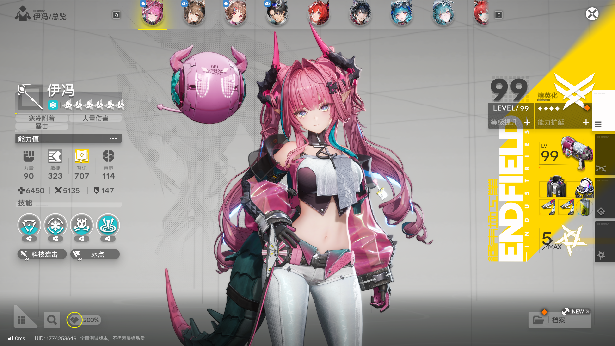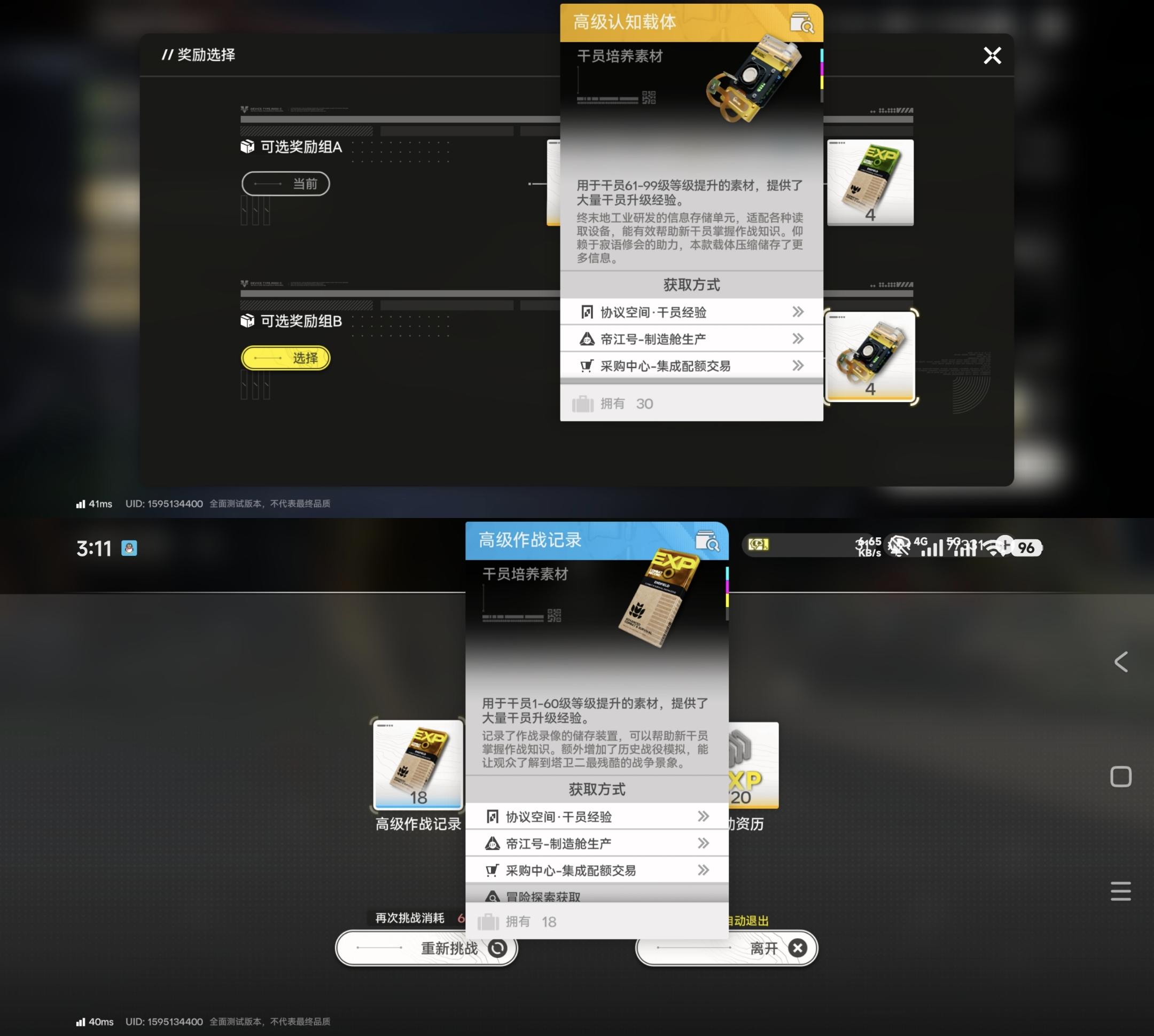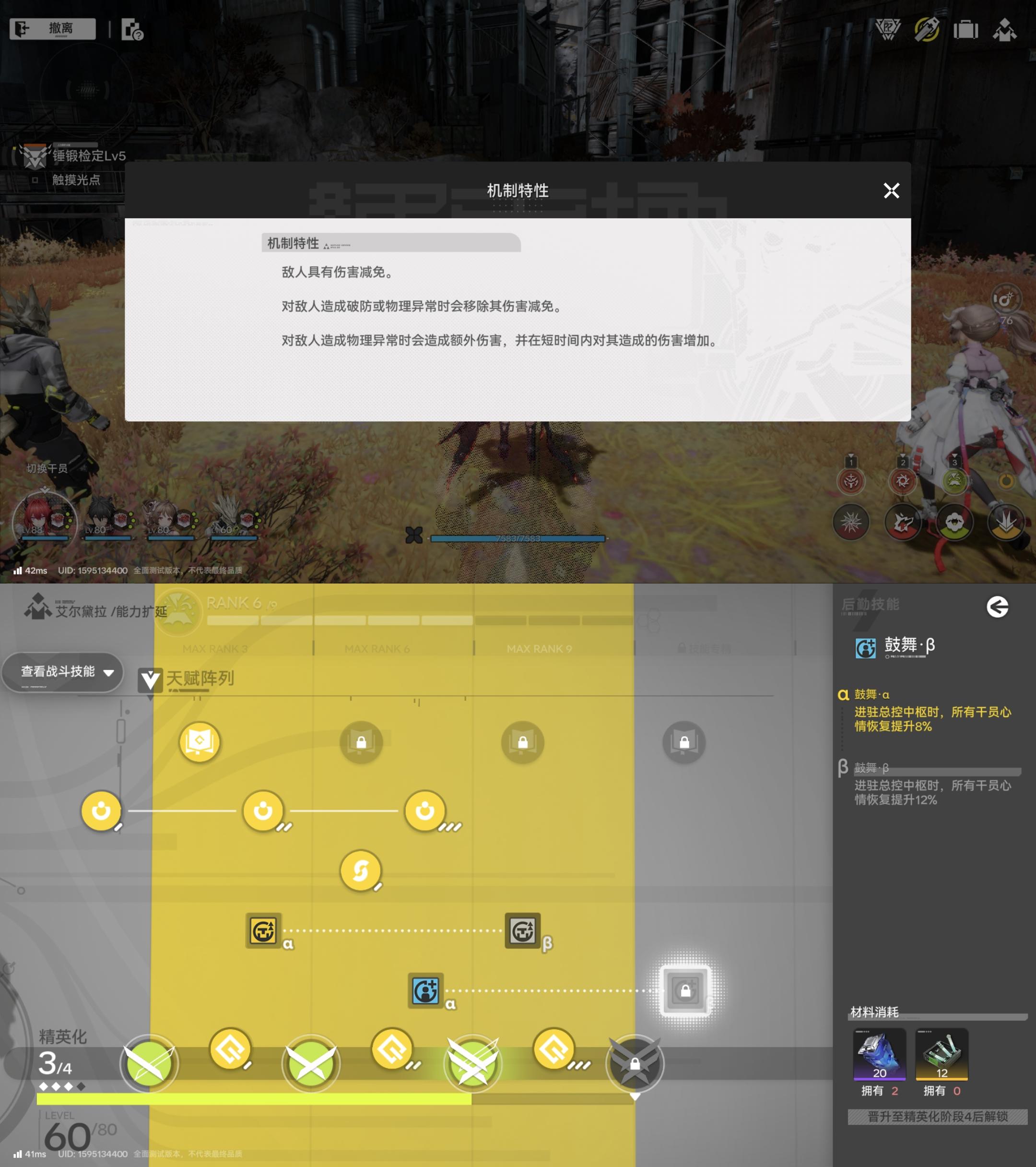 3、干员与养成方面,干员有四大能力值,提供不同的基本属性,其中还会有主副能力各一个,额外提供攻击力加成。职业方面有六个,仅作为区分定位,与强度暂时还不挂钩。属性方面分为物理、灼热、寒冷、自然、电磁,配队是根据属性来的近乎纯色队。战斗方面,战技采用的是点数制而不是cd制,个人感觉点数有点太少。攻击模式和伤害类型方面也有需要辨别的内容,不过这就留给公测的大佬出攻略了,我只提一点,战斗中包含层数的buff没有数字显示以及战技意义不明的高亮会导致玩家一头雾水,纯靠脑子记总会出错的,要改啊老鹰。角色等级上限为99级,每20级会受到能力扩延和世界等级的限制。能力扩延中除了突破需要的精英化,还分为战斗技能、天赋阵列,战斗技能没什么好说的,点就完了。天赋阵列就有不少槽点了,两个天赋属性不用说。但剩下的,什么叫我提升信赖之后还得花资源点亮固有属性,什么又叫生产天赋也得花资源点亮,这都什么跟什么。武器方面,与其他游戏略有不同的是这个基质,是需要你花费体力和道具刷去对应词条的基质,并同类蚀刻提升能力的,但有概率失败。装备方面,是靠基建制造的,只需要搭建产线就可以免费获得,不过嘛,五星装备还是得吃同类刷词条的,同样有概率失败。Emmmm,我们终末地也有自己的DNF?
