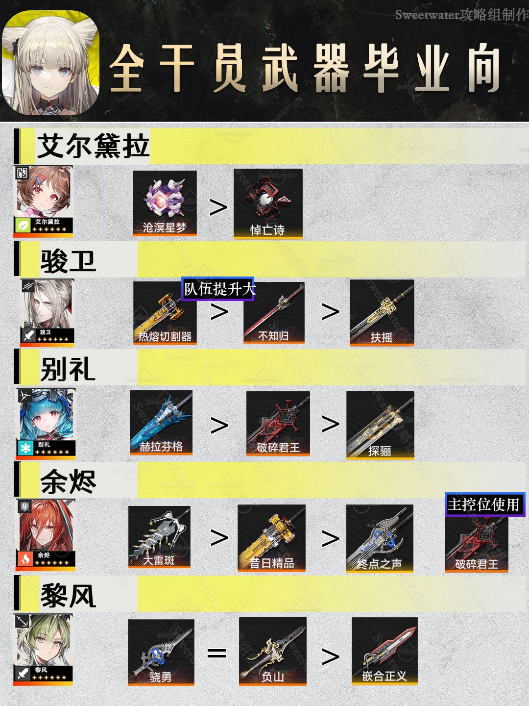 关于武器,从左到右依次排序推荐; 装备配装则,考虑通用性,例如物理队也可以出四失衡套打,但不一定通用,专精/竞速/高难挑战的打法配装需要自行根据自己的角色潜能、装备情况研究修改。 ——————————— 补充几点比较重要的问题 Q:紫色装备词条和部分角色的定位不搭配,为什么要这样搭配? A:紫色装备是过渡,类似四星的武器,主要词条对就好,别怕浪费。合理的基建规划线路下,生产挺快的。 Q:关于黎风,