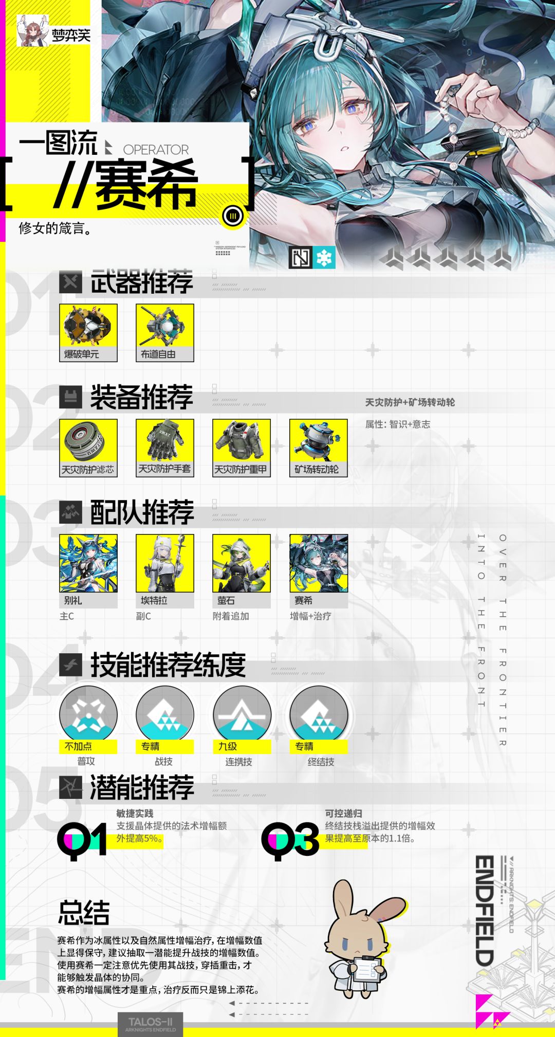 做图比较慢,在调整,有什么问题欢迎大家评论区交 流。 之后几个干员会在本帖补齐。 别礼以及伊冯公测有所调整,之前一图流有点成废稿 了,正在重新修改。 #明日方舟终末地 #明日方舟终末地公测 #明日方舟终末地攻略