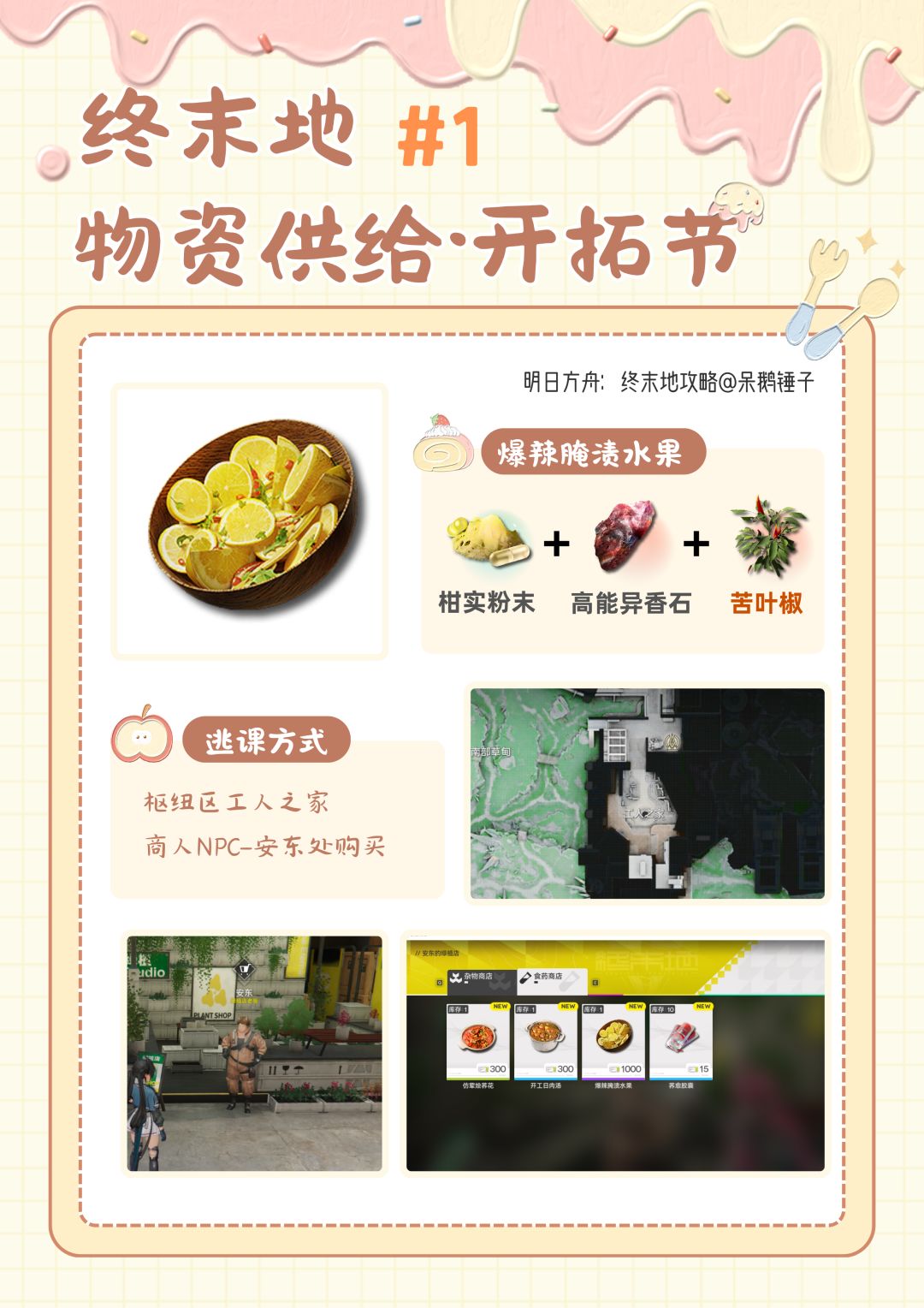 ———————— 今天(3月19日12点)新开的活动,需要用食品与NPC交换物资; 活动持续7天,每天解锁1个关卡需求,给的养成资源挺多; 图中列出来对应食品的制作材料,有材料的可以直接合成,没有材料不想去收集的,也可以对着逃课攻略找对应的NPC购买;