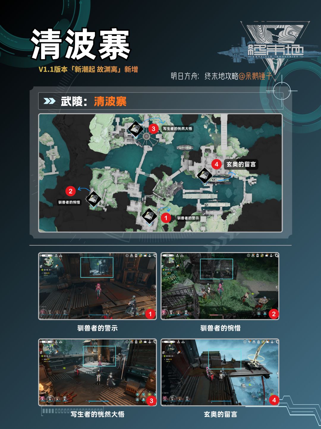在1.1版本新增了「清波寨」的档案收集,还是老样子200嵌晶玉; P1是1.1版本新增的内容; P2-P9是1.0版本已有的,新玩家入坑可以全部跟着找完~