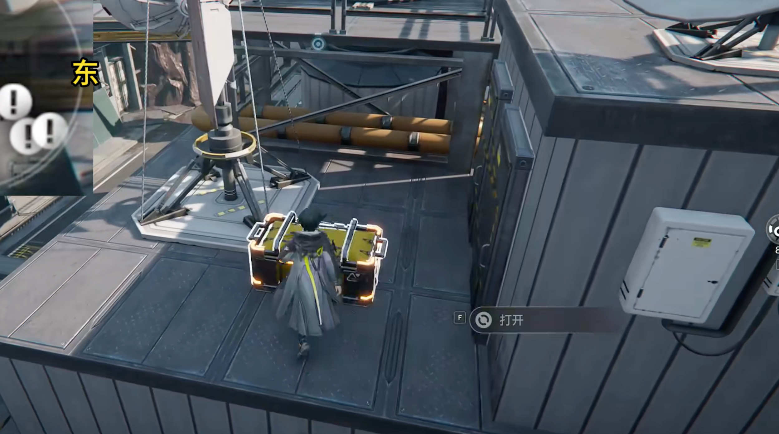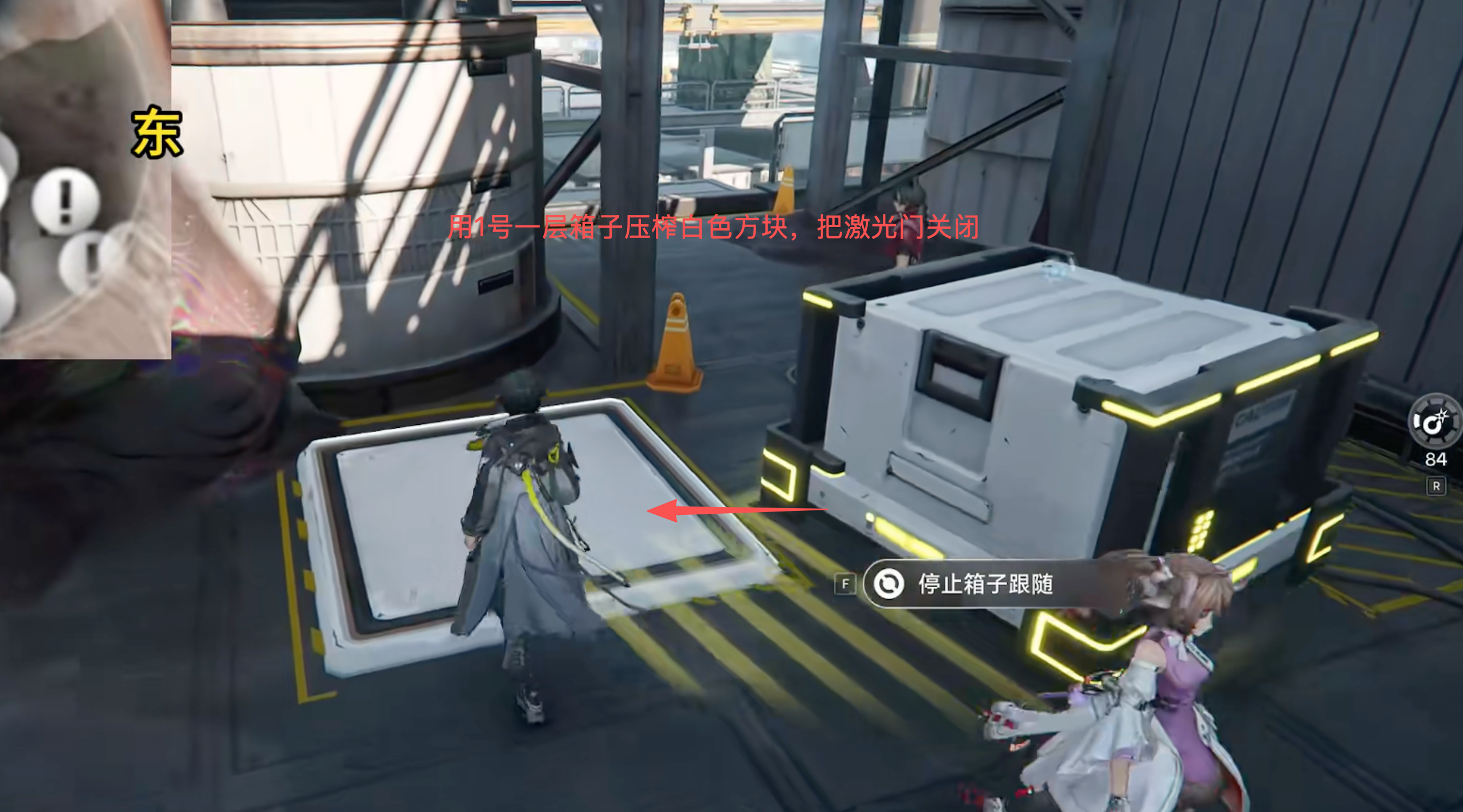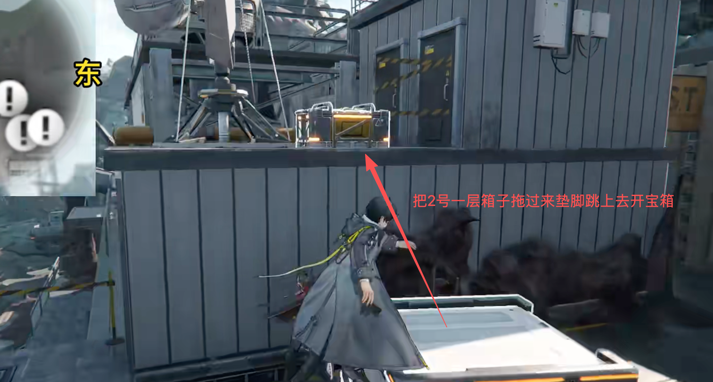 用1号一层箱子压住白色方块关掉门,再用2号一层箱子垫脚跳上去开宝箱