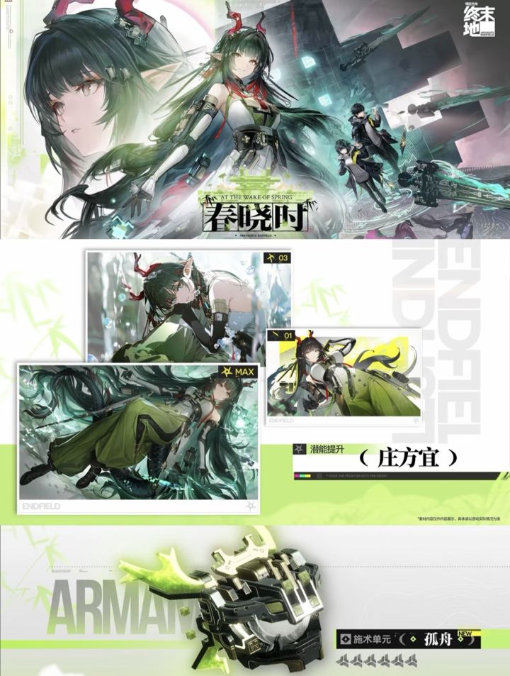 ⚡ 庄方宜实装:雷系电磁大C上线时间:4月17日版本更新后卡池机制:单UP寻访「春雷动」(持续至5月22日)角色定位:六星突击干员,核心电磁输出。战技消耗导电生成青霆剑,大招切换「天理合真」形态强化普攻与战技,空中输出不易打断,电队必抽核心。🎁 福利拉满:白送月卡+6000玉• 免费资源:版本更新后全服送「焕新月卡赠礼」,累计可领6000嵌晶玉+1200理智+120张双倍票,零氪也能攒出