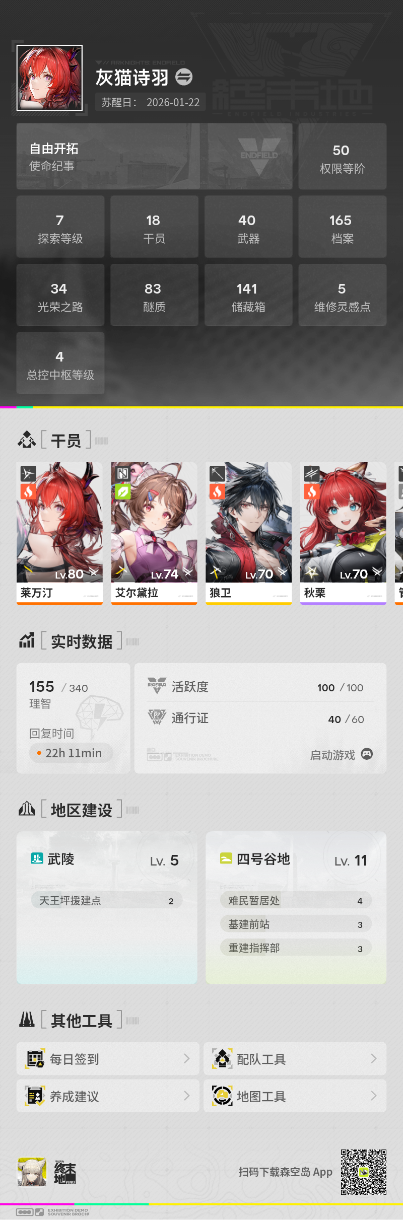 武陵还没去,四号谷地已经全部肝完,基建,宝箱,秘制,滑索,全部肝完。。我抽卡是开服第一天氪金抽的,之后一抽没动开始肝任务和地图,反正不算抽卡劵大概4万玉。。。要说扣,也没那么扣,肝完新手村一个大保底肯定是有的。然后一个大保底,抽个专武肯定也是没什么问题的。。。另外可以叫我一声那个吗?还有个问题我特别迷茫,眼看四号谷地毕业了,我的基建不就废了,这天天