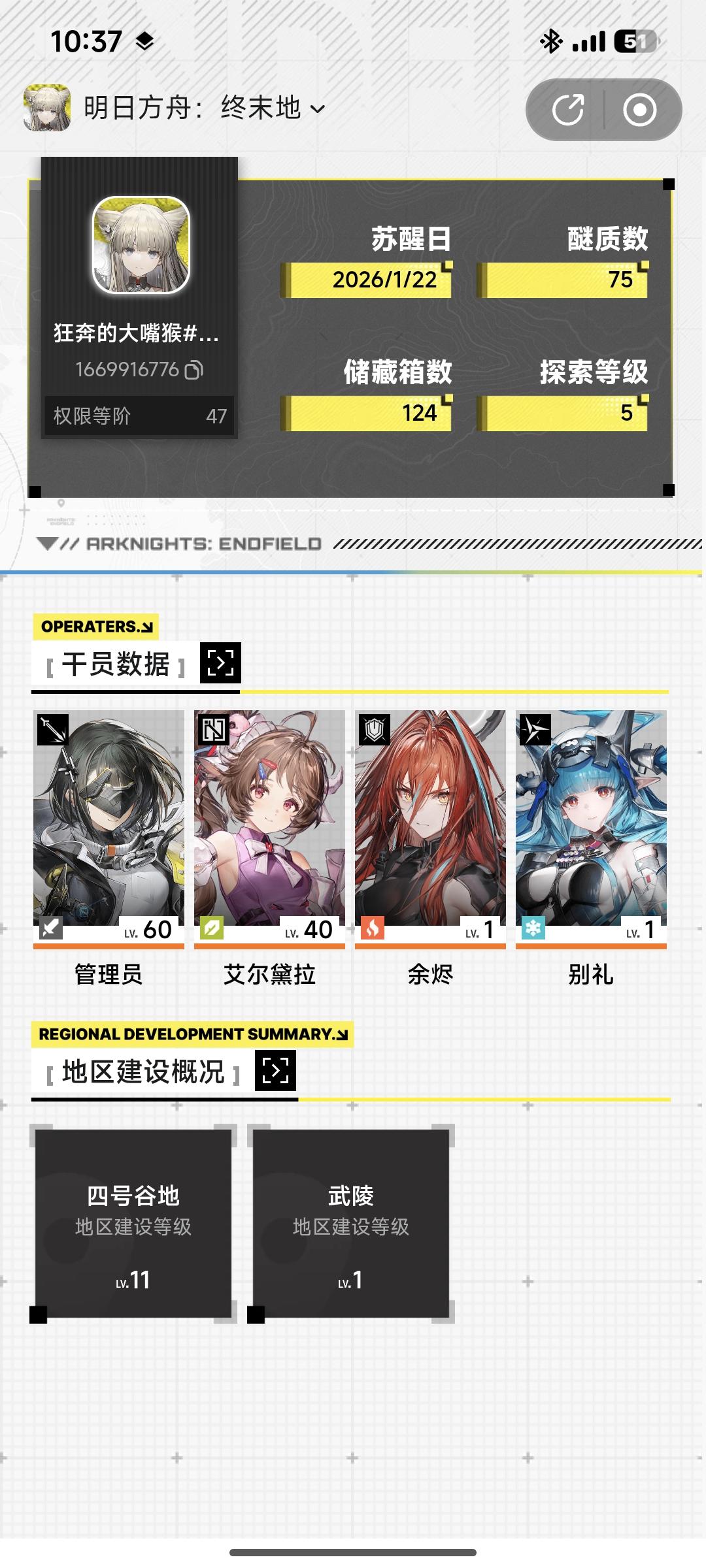 武陵还没去,四号谷地已经全部肝完,基建,宝箱,秘制,滑索,全部肝完。。我抽卡是开服第一天氪金抽的,之后一抽没动开始肝任务和地图,反正不算抽卡劵大概4万玉。。。要说扣,也没那么扣,肝完新手村一个大保底肯定是有的。然后一个大保底,抽个专武肯定也是没什么问题的。。。另外可以叫我一声那个吗?还有个问题我特别迷茫,眼看四号谷地毕业了,我的基建不就废了,这天天