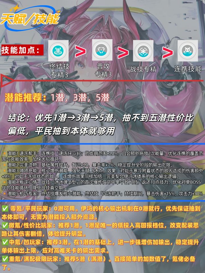 伊冯是6星冰体系绝对核心主C,适配纯冰队,其缺点为终结技回转偏慢、易被打断,需绑定冰体系队友才能发挥完整强度。✅️技能加点方案9级前:全技能拉满,保证基础作战强度。9级后/资源有限:优先拉满战技,其次升级连携技,终结技按需升级,普攻最后补满✅️双冰高配队(毕业首选,对单Boss/高难本)阵容:伊冯(主C)+ 别礼(副C/冰系核心拐)+ 阿列什(冰辅/高频挂冰)+ 塞希/治疗(充能/生存兜