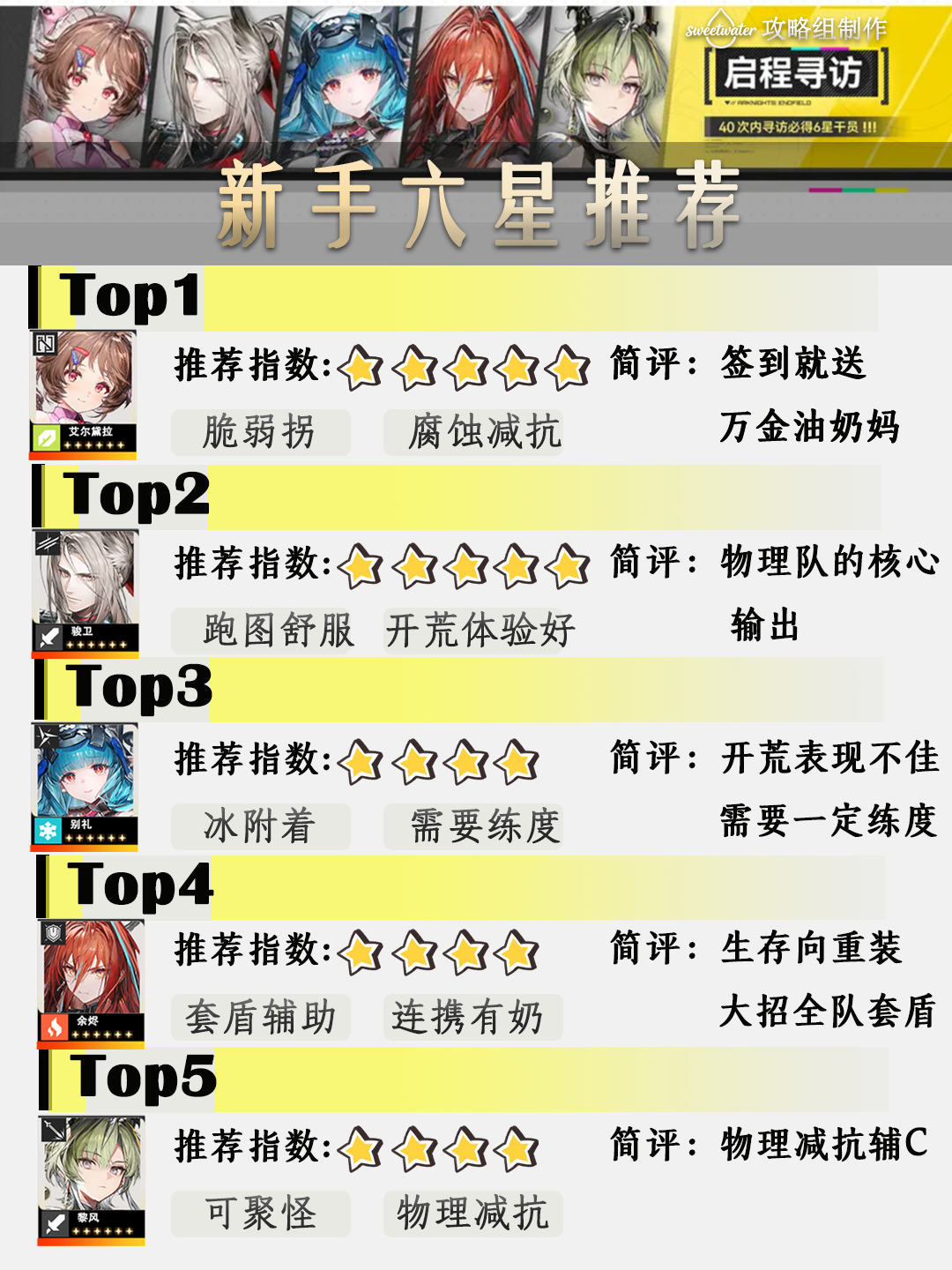 HI,这里是SW攻略组。根据三测强度数据给出以下推荐:小羊>小爷>别礼=余烬>黎风注意的是别礼需要一定练度,才能有输出。开荒期比较弱势,余烬算是轮椅辅助,有盾有奶。能给前期不错的游戏体验,保证角色不暴毙。大家还有什么其他疑问也可以打在评论区!如有问题也欢迎大家指正交流#终末地 #明日方舟终末地 #明日方舟终末地全面测试 #明日方舟终末地pc #终末地定档1月22日 #明日方舟终末地公测 #