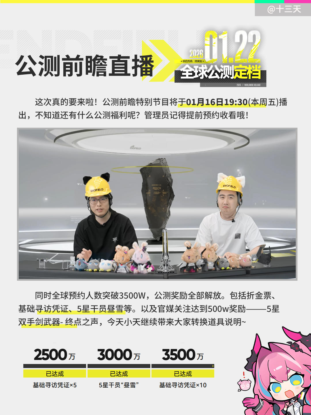 1月12日消息,《明日方舟:终末地》官方发布动态,正式宣布公测前瞻特别节目将于2026年01月16日19:30播出。据了解,本次公测前瞻特别节目将在B站、微博、小红书、快手、斗鱼、虎牙和TapTap平台同步播出。《明日方舟:终末地》作为鹰角网络继《明日方舟》的核心IP产品,吸引了许多玩家关注。不过在游戏在内测的体验并不是十分“有趣”,高强度的游戏内容和高难度的游戏设计让玩家对于游戏本身怨气不