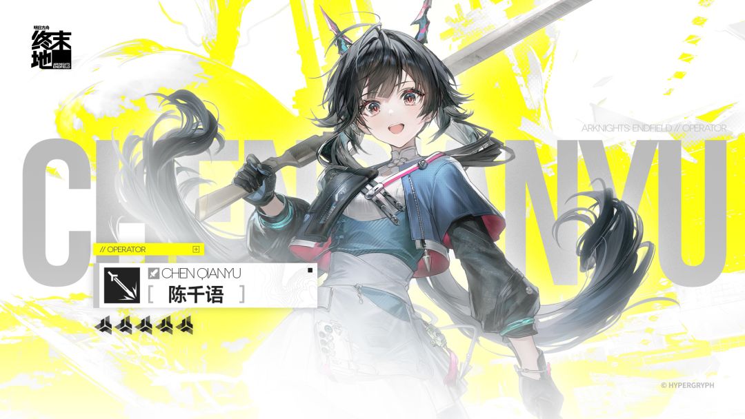 《明日方舟:终末地》干员战斗演示 - 陈千语 剑起有光,光若奔夜! ———————————— 《明日方舟:终末地》全球公测正式定档2026年1月22日。 ▼//前往官网预约:https://endfield.hypergryph.com/ 全球预约里程碑解锁至对应阶段且全球官方社媒关注数达指定数量后即可获得5星干员【昼雪】、【基础寻访凭证】×20、5星武器【终点之声】等奖励。