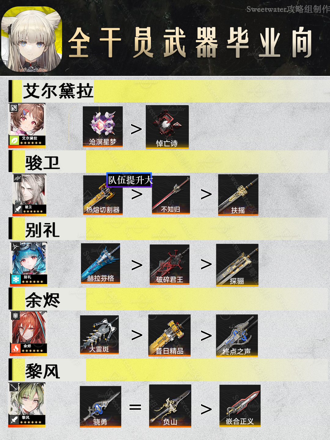 你们以为装备、级数、技能满级=毕业?错了这只是刚开始!!一个角色完全毕业大概需要1个月以上!武器蚀刻-这个和其他游戏刷词条一样,而且3个词条对应武器3个属性才会生效。-不用基建商店刻度卷刷=浪费体力,只能刷狗粮。-买刻度卷=基建毕业,我每天谷地+武陵500万以上收益,但是刷42蚀刻,需要武陵的卷。-当你的武器刷出3属性生效词条后就可以刷其他角色武器,狗粮任何属性都可以。-没有修改词条的