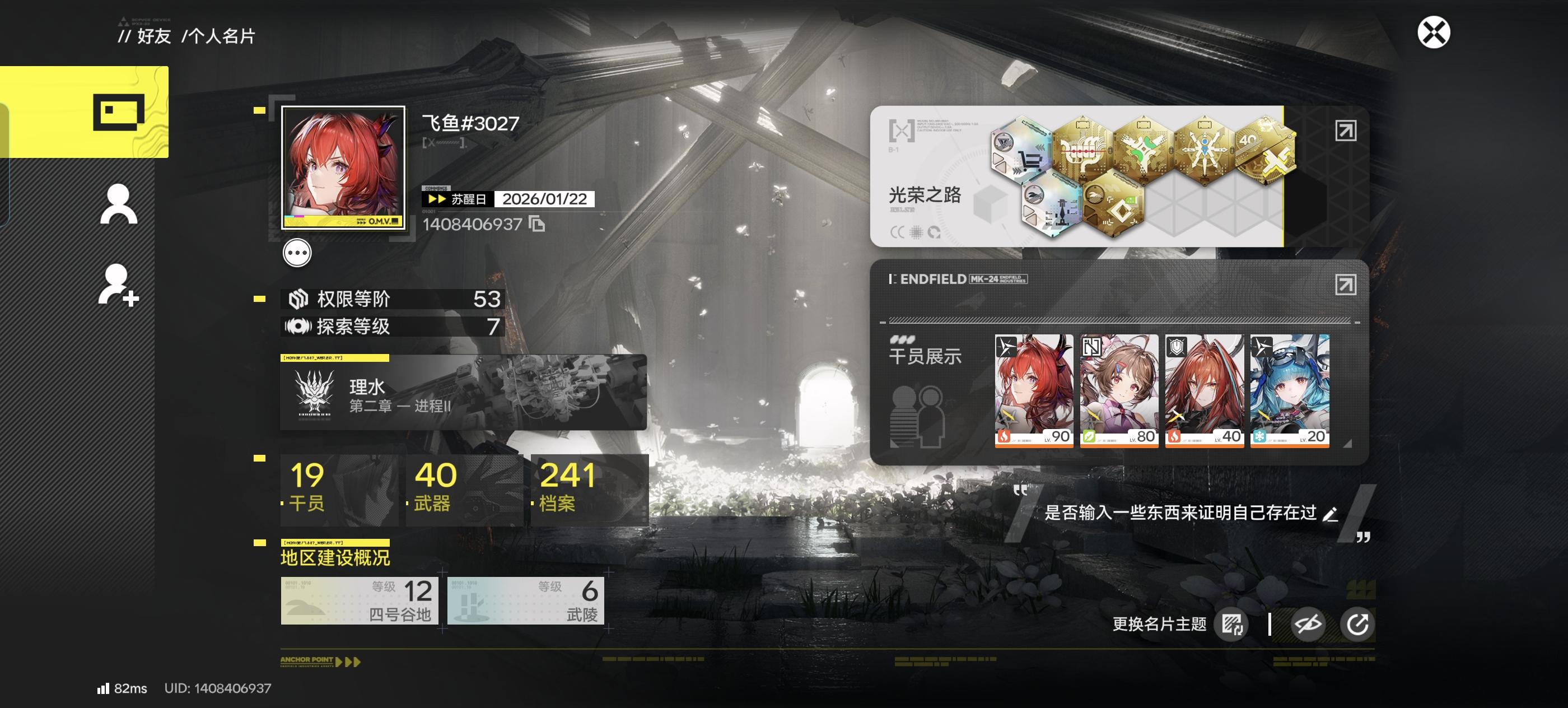一. 42的充能套为四散件终结技充能,例如落潮轻甲,长息护手,纾难印章*2。刚需专武。二. 骑士精神和布道自由小羊的回血无法触发。(但小羊马上送专武了,伟大!)三. 骏卫热熔切割>不知归,主要原因是对整个队伍提升大。不知归更倾向于骏卫主控位。四. 小陈的钢铁余音满潜完爆扶摇。且扶摇暴击率小陈吃不到,词条三的失衡日常基本没用,打boss也就吃个一次。大家还有什么其他疑问也可以打在评论区!如