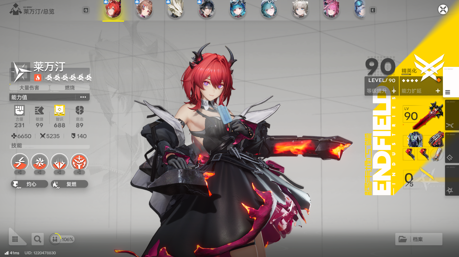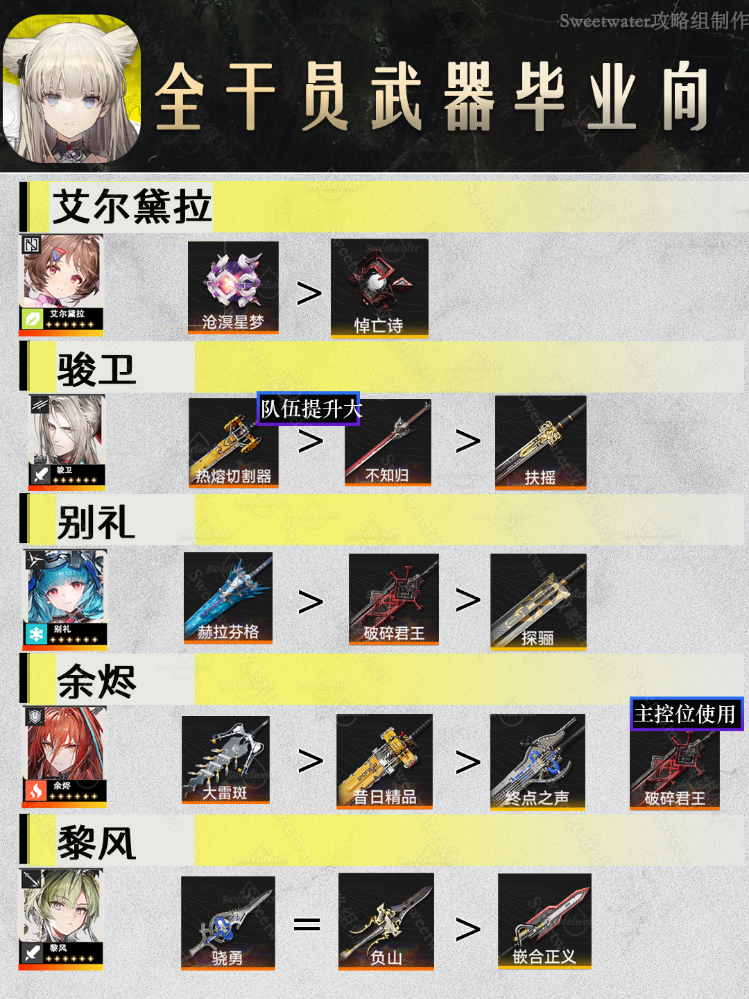 一. 42的充能套为四散件终结技充能,例如落潮轻甲,长息护手,纾难印章*2。刚需专武。二. 骑士精神和布道自由小羊的回血无法触发。(但小羊马上送专武了,伟大!)三. 骏卫热熔切割>不知归,主要原因是对整个队伍提升大。不知归更倾向于骏卫主控位。四. 小陈的钢铁余音满潜完爆扶摇。且扶摇暴击率小陈吃不到,词条三的失衡日常基本没用,打boss也就吃个一次。五. 余烬主控位用破碎君王。生存为就剩下的