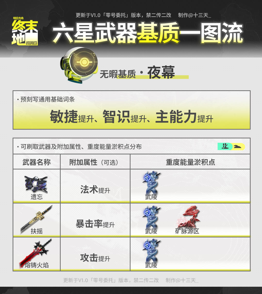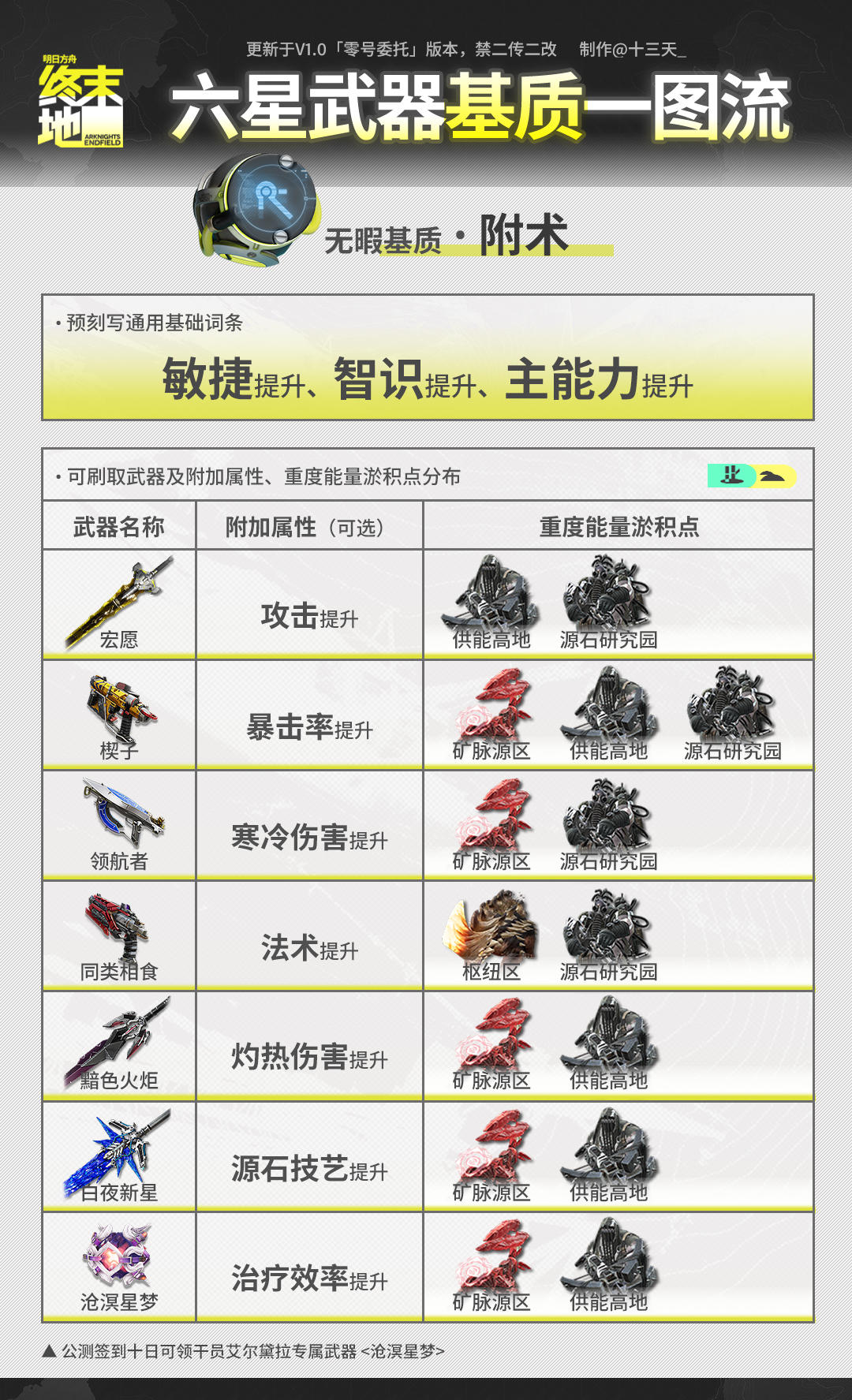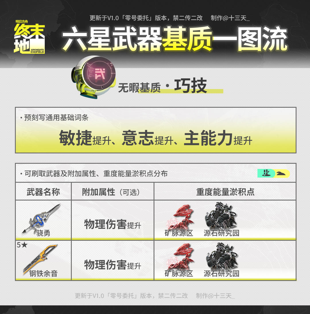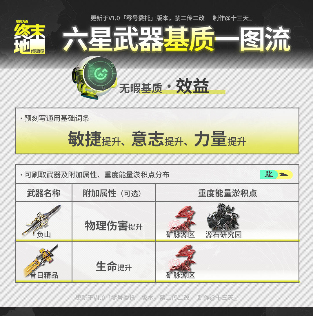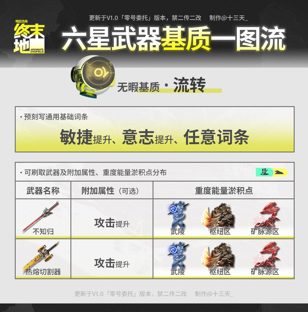 ///管理员们好!这里是已经拉完电线长草等活动的天(>。 ☆) 开服爆肝一周多,相信大家已经熟悉一路从四号谷地并肩行动的干员作战方式,且已获取了与之匹配的武器。 为了进一步提升武器属性和干员作战能力,大家可以进行武器基质(俗称珠子)蚀刻。 今天就带来全六星武器基质刷取一图流,相信不知道如何选择得你可以用得上! ▼//本篇内容基于刻写:①基础词条推荐 ②附加词条可选 ③武器技能属性④
