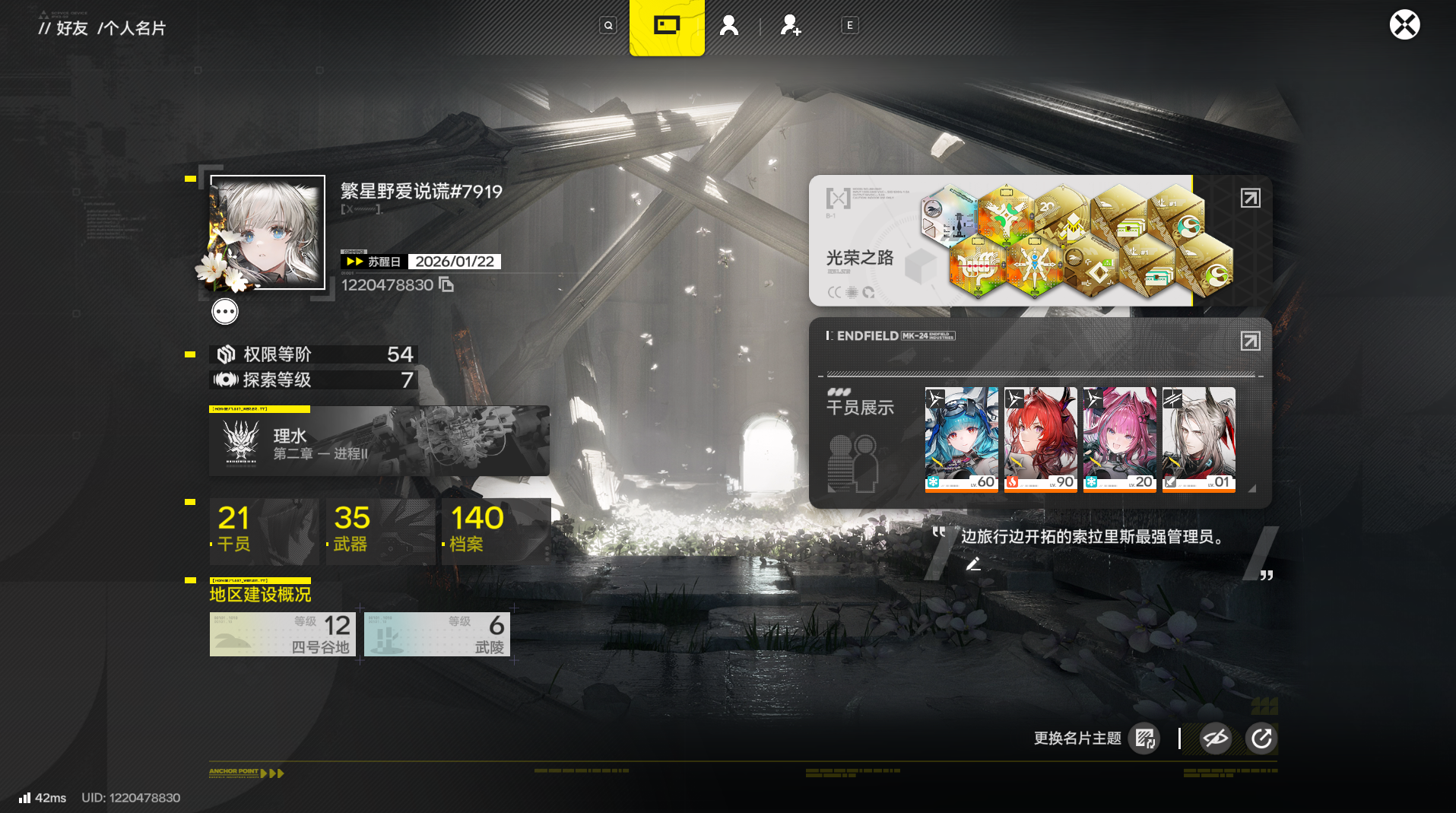 一. 42的充能套为四散件终结技充能,例如落潮轻甲,长息护手,纾难印章*2。刚需专武。二. 骑士精神和布道自由小羊的回血无法触发。(但小羊马上送专武了,伟大!)三. 骏卫热熔切割>不知归,主要原因是对整个队伍提升大。不知归更倾向于骏卫主控位。四. 小陈的钢铁余音满潜完爆扶摇。且扶摇暴击率小陈吃不到,词条三的失衡日常基本没用,打boss也就吃个一次。五. 余烬主控位用破碎君王。生存为就剩下的
