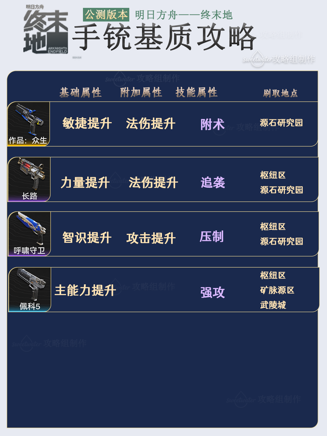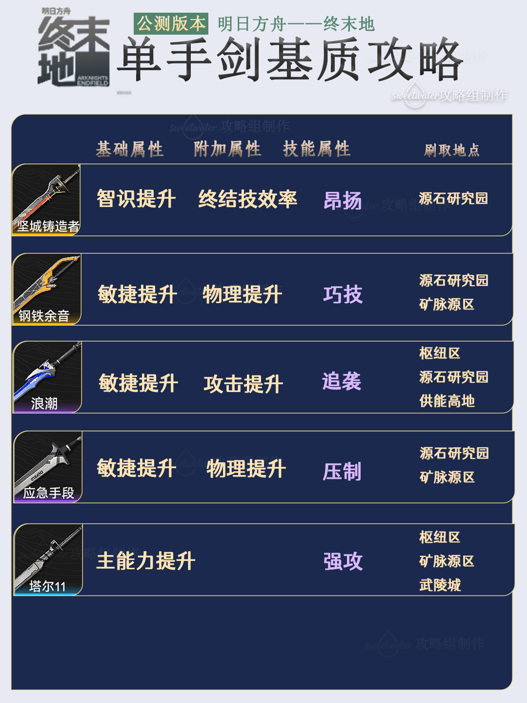 这是篇全武器的基质,给出了每把武器的所需的基质属性以及刷取地点......还有两篇分别是四号谷地和武陵基质掉落对应的武器(只有五星和六星)大家还有什么其他疑问也可以打在评论区!如有问题也欢迎大家指正交流#明日方舟终末地 #明日方舟终末地公测 #明日方舟终末地攻略 #终末地 #终末地攻略