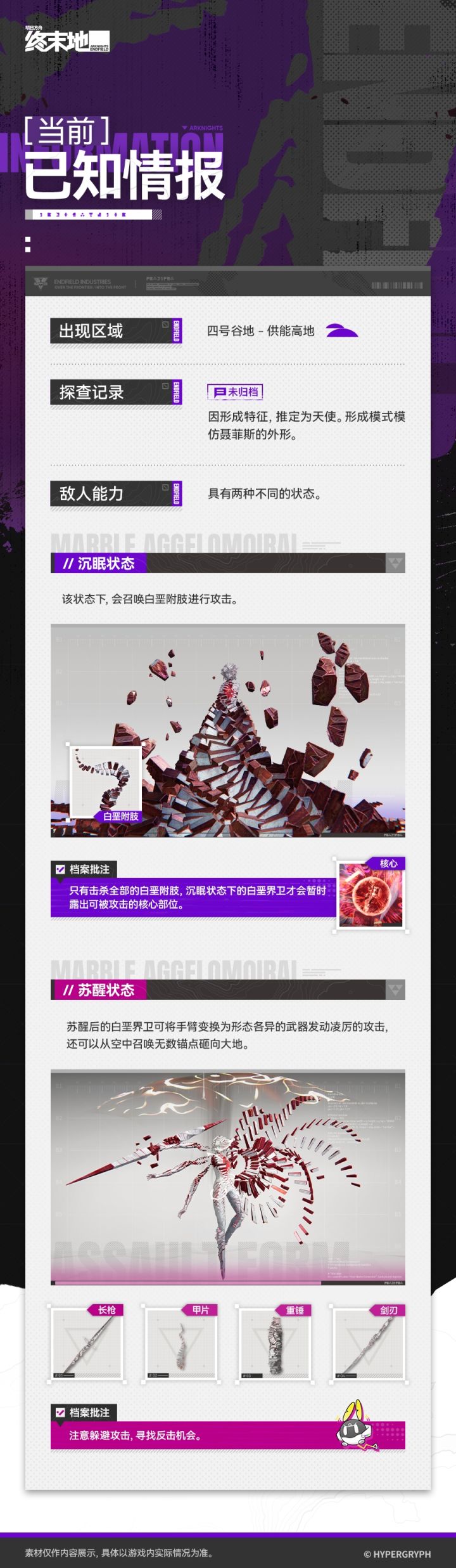 管理员您好,以下为您整理了敌人「白垩界卫」当前已知情报。未归档。因形成特征,推定为天使。形成模式模仿聂菲斯的外形。