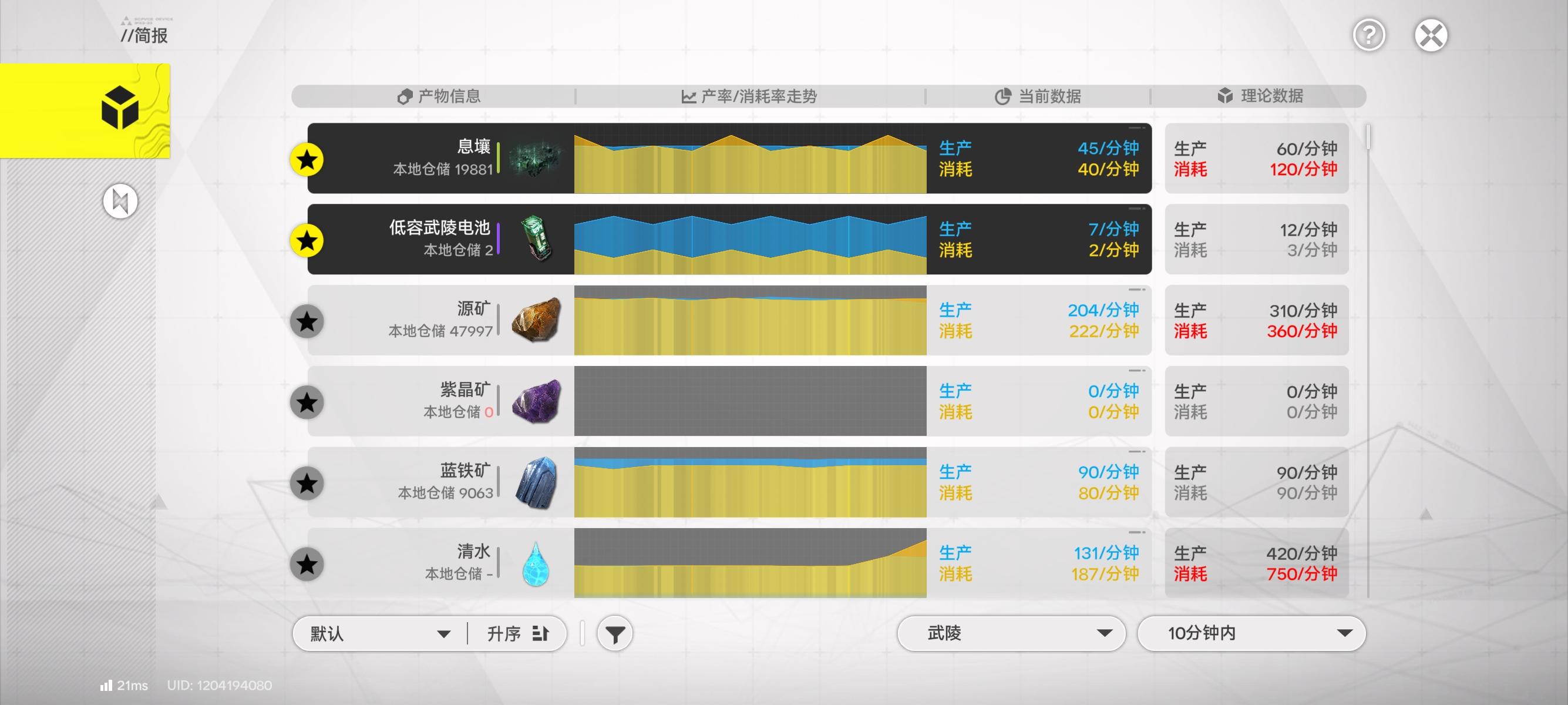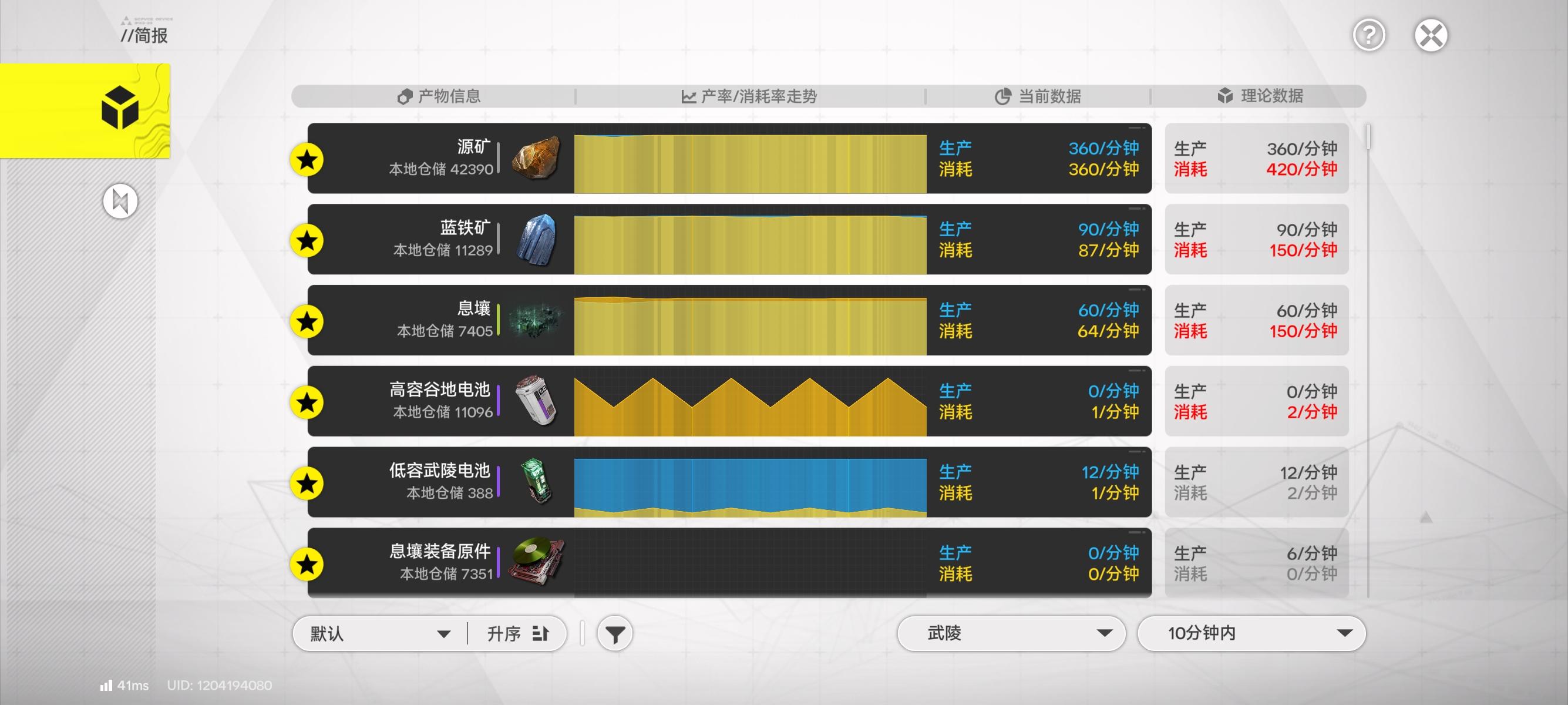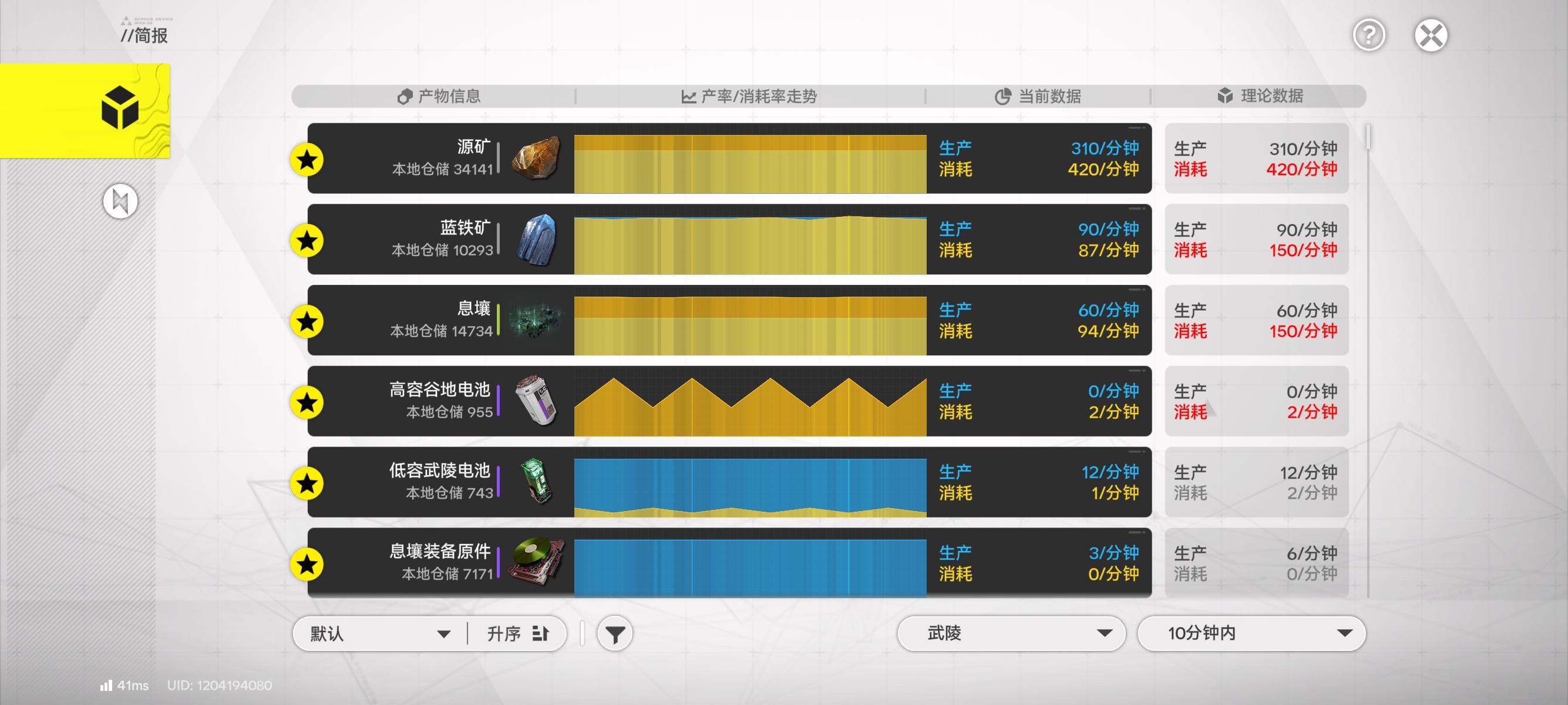 武陵怎么会跟不上卖货速度啊,气你们也是跟不上嘛,还是说我个人情况。。。好了,根据水友的提醒,改了一下,现在对了,之前连60息壤产能都没拉满,绝对是哪里不对劲现在息壤60产能拉满了,正常了,电池消耗1武陵+1紫电(算了算,每天消耗2160紫电,我手动搬个两趟就够了)现在息壤支出超了,等晚上把装备线关闭就好了。。。修改后的,蓝矿效率没拉满,怎么才87息壤消耗又高了,怎么又64