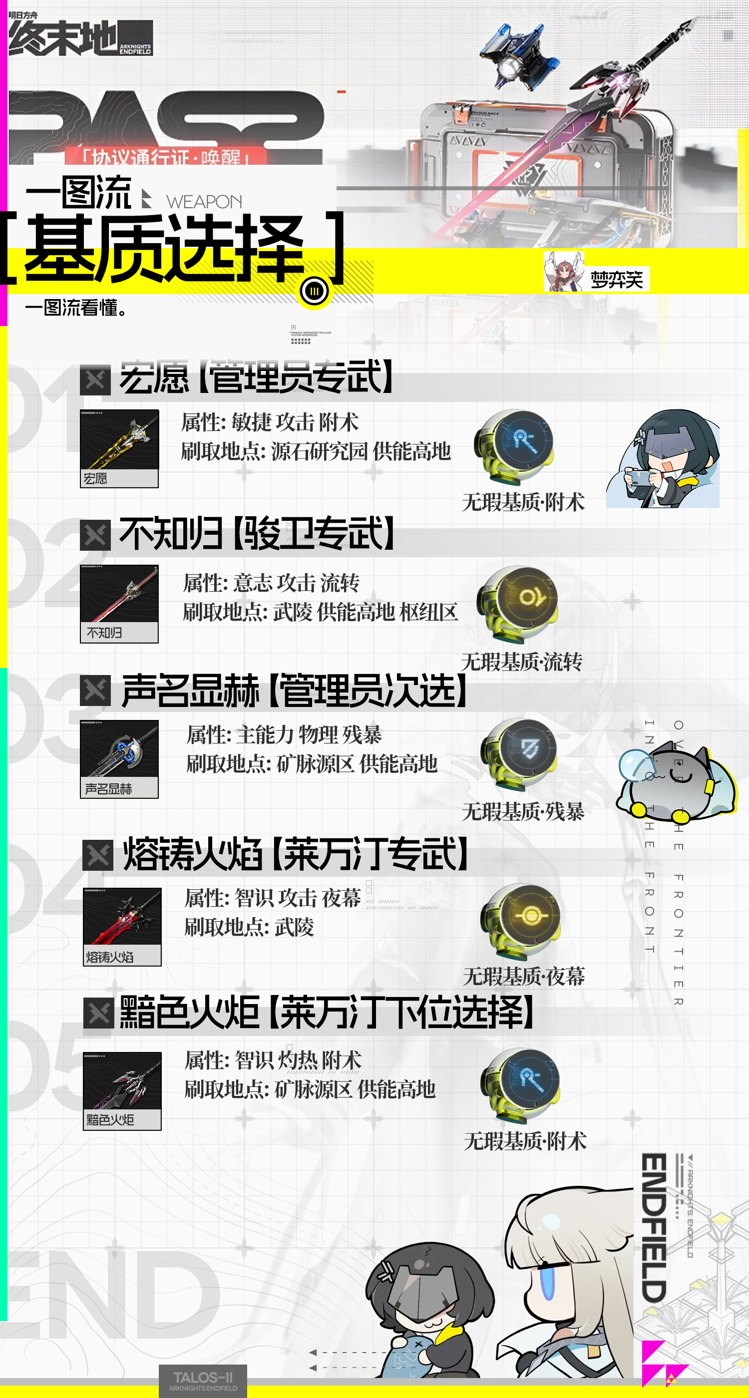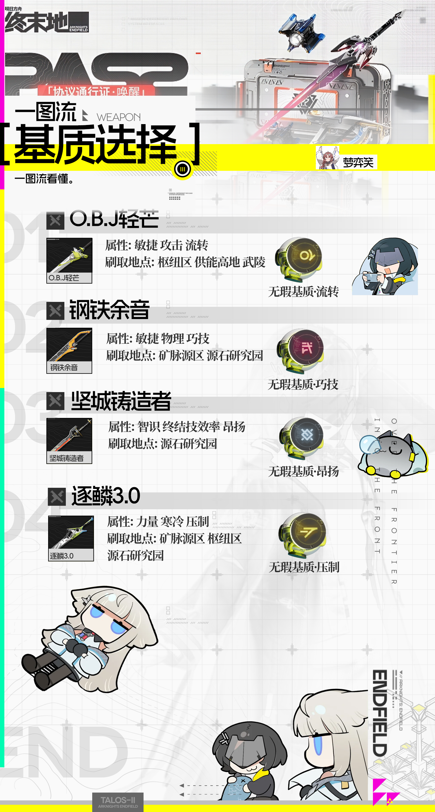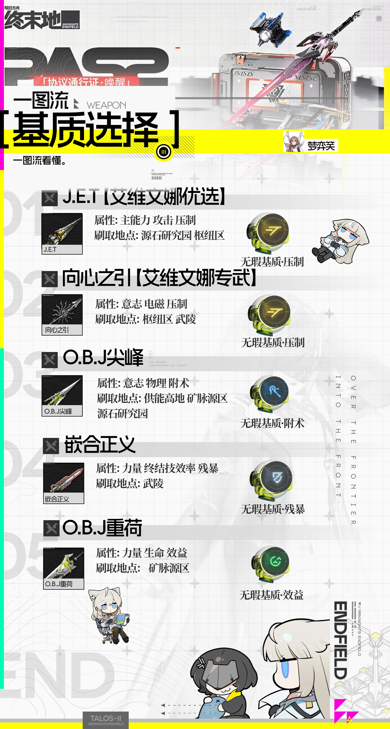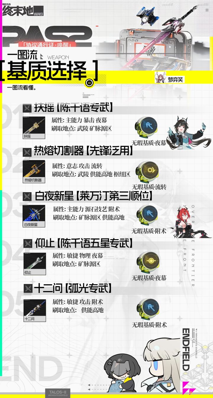 整理了一下武器的特性以及基质刷取的位置,希望对大家有所帮助。最后附上了自己在刷基质时的选择,如果有需求会进一步整理。如果有贴图错误欢迎评论区捉虫,抽时间做的图,难免有错漏。(看到会改)#明日方舟终末地 #明日方舟终末地公测 #明日方舟终末地攻略