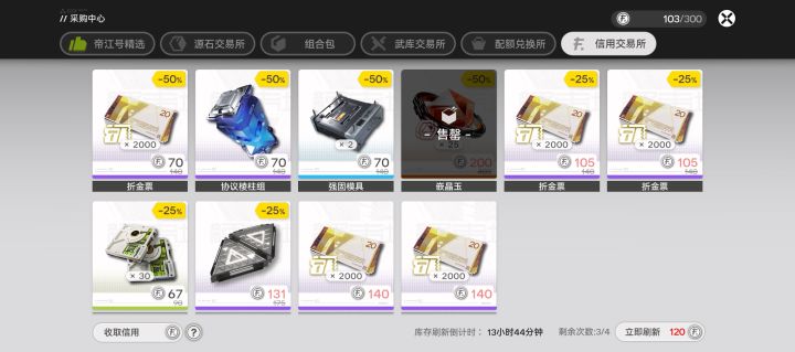 才知道每天可以刷新四次,而信用商店可能出20武器配额或者25嵌晶玉,武器配额840信用点,嵌晶玉400信用点,得刷新打折。每天给300,帝江号助力,会议室交流,送快递。也就是说,如果想要配额和嵌晶玉,就买不了那些小垃圾了,得留着刷新买打折的,不刷的话倒也不会差多少,毕竟不是每次刷新都能有这俩,也不是每次刷新完都买得起的