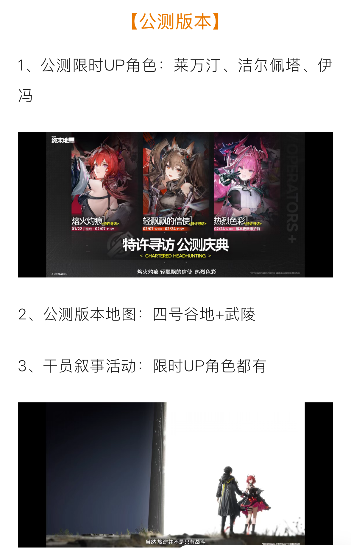 《明日方舟:终末地》公测前瞻特别节目现已结束,感谢管理员的观看,为您奉上本次公测前瞻特别节目的情报。▼//公测庆典特许寻访公开▼//公测优化调整▼//干员寻访 & 武库申领▼//玩法展示 & 未来前瞻▼//更多活动▼//联动合作▼//周边情报————————————《明日方舟:终末地》全球公测将于1月22日正式开启!▼//前往官网预约:https://endfield.hype