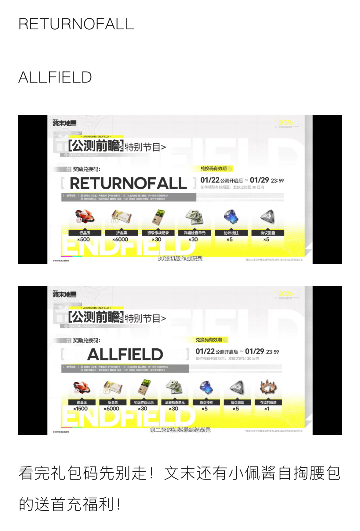 「终末地公测」福利兑换码