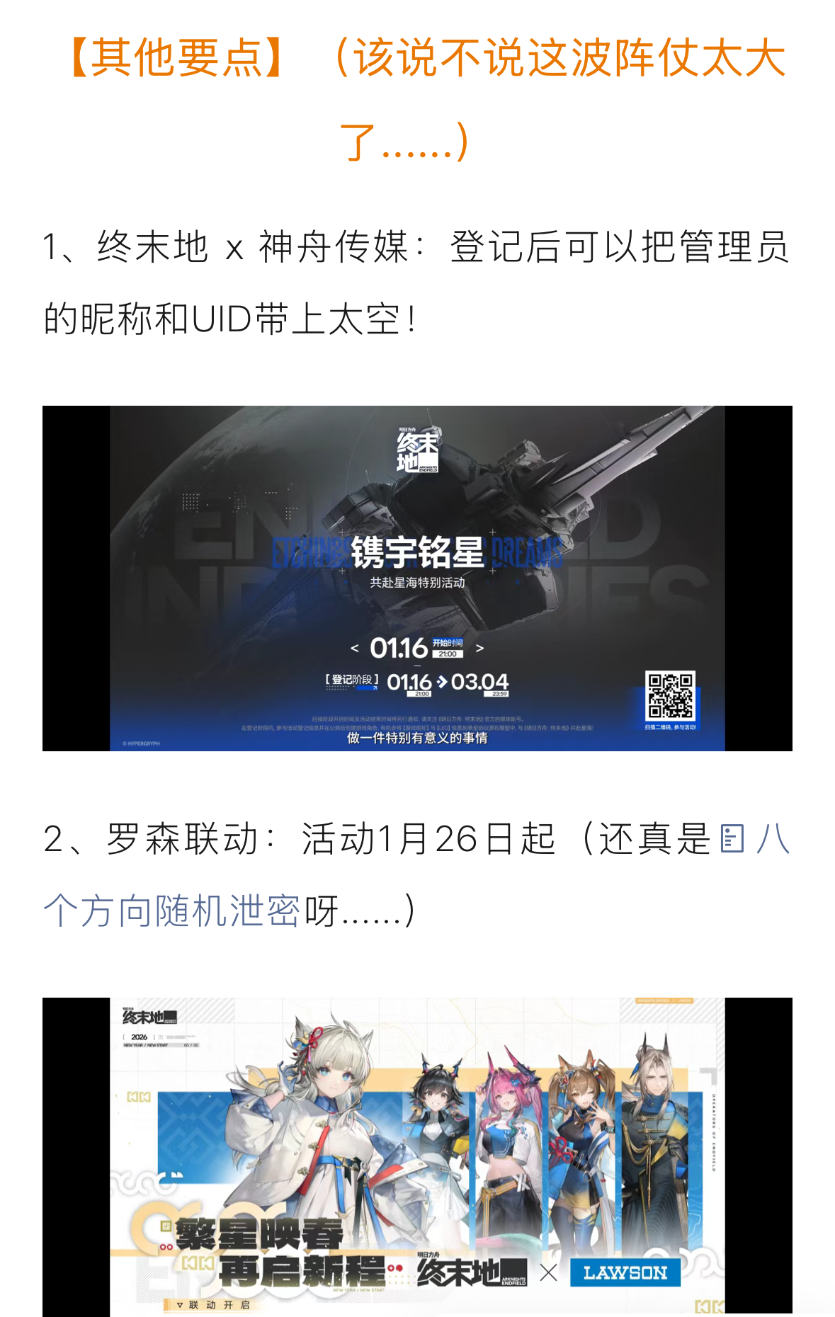 塔卫二全域广播 | 状态:实时接入中通往塔卫二的行动指引已准备就绪。前路已明,期待与您同行。参与回帖讨论公测前瞻特别节目相关资讯,即有机会赢取实物周边!在塔卫二的每一次探索,都在为这片大地注入新的可能性。预约《明日方舟:终末地》游戏及关注「终末地工业」账号,并在本帖内发表对《明日方舟:终末地》公测前瞻特别节目相关内容的讨论,即有机会获得游戏相关周边。我们将从成功参与活动的管理员中,随机抽