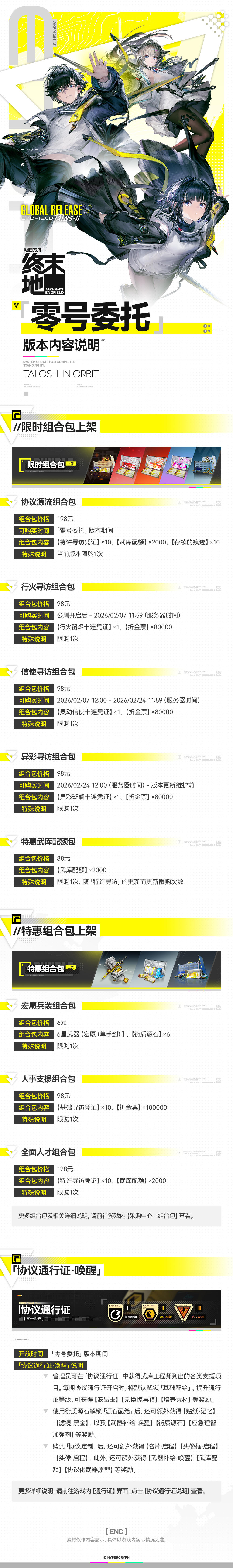 《明日方舟:终末地》全球公测将于1月22日正式开启!以下为「零号委托」版本内容说明,请管理员查阅。跨越边境,直至前线。塔卫二的一切,等待您的探索。————————————《明日方舟:终末地》全球公测将于1月22日正式开启!▼//前往官网预约:https://endfield.hypergryph.com/《明日方舟:终末地》全平台预约进行中。全球3500万预约里程碑奖励及全球官方社媒关
