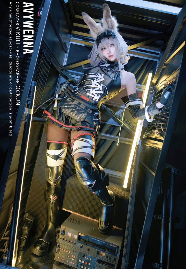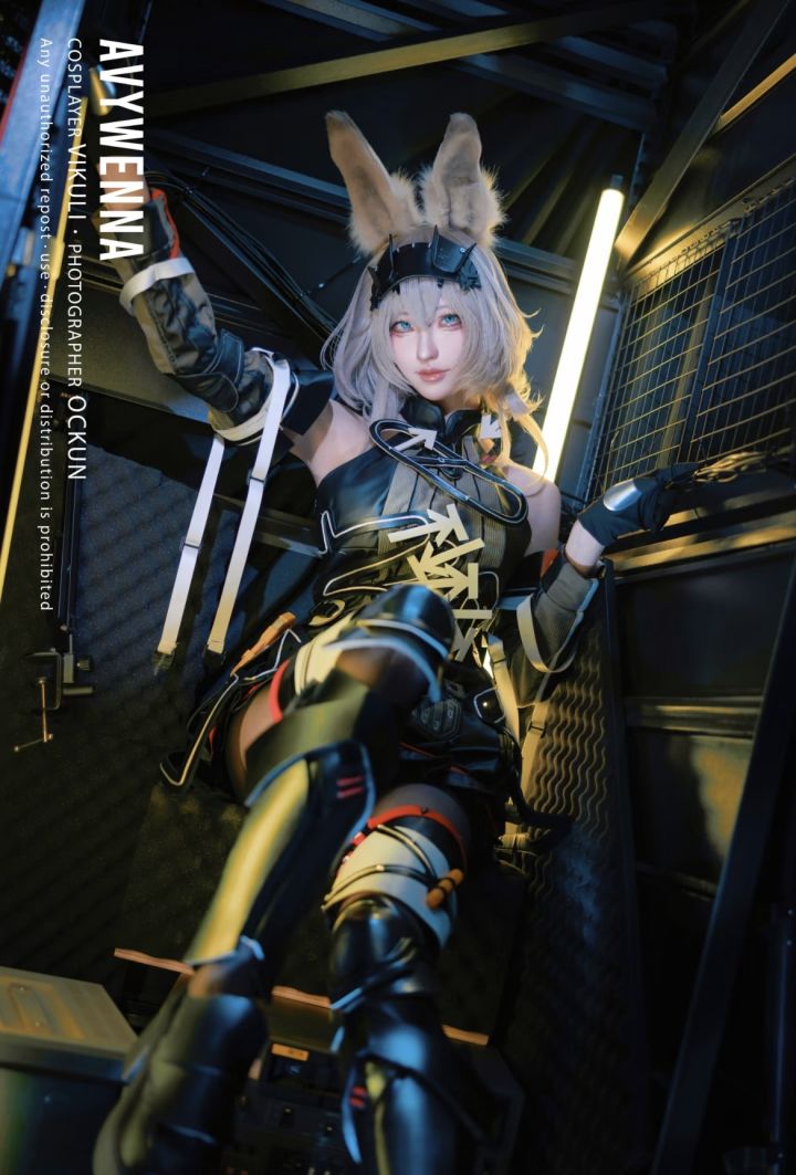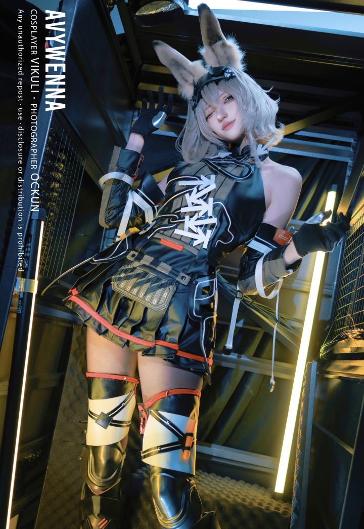 这组cos完美还原了角色的飒爽与干练,浅灰兔耳造型逼真,毛发质感细腻,搭配黑色发饰,尽显角色的酷飒气质。妆容精致冷艳,蓝瞳眼妆凌厉,唇色淡雅,将角色的坚韧与气场完美呈现。服饰细节拉满,黑灰配色的紧身战衣线条流畅,皮质护具、绑带设计做工精细,金属纹路还原角色设定,尽显干员的干练与帅气。姿态舒展大气,倚靠金属架的造型气场全开,长靴与护膝的设计更显英气,将角色的飒爽与力量感完美融合。暗调工业风背景氛围感