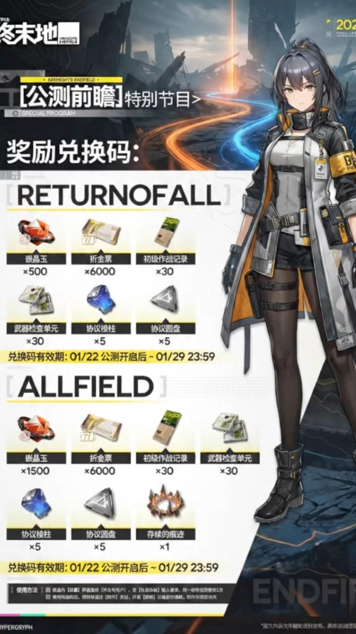 前言:在三测的基础上,终末地做出了部分优化,以及提供了更多的福利。但是在核心玩法上没有改变,依旧坚持工业为核心的理念。虽然在养成方面减负,但是终末地依旧是一个需要玩家长期经营的游戏,这与如今快节奏的趋势相反,无疑增加了不确定性,正如海猫在前瞻里说的一样,这个游戏的未来还需要玩家决定。话不多说,先从福利说起。福利:兑换码:ALLFIELDRETURNOFALL总计2000玉(4抽),12