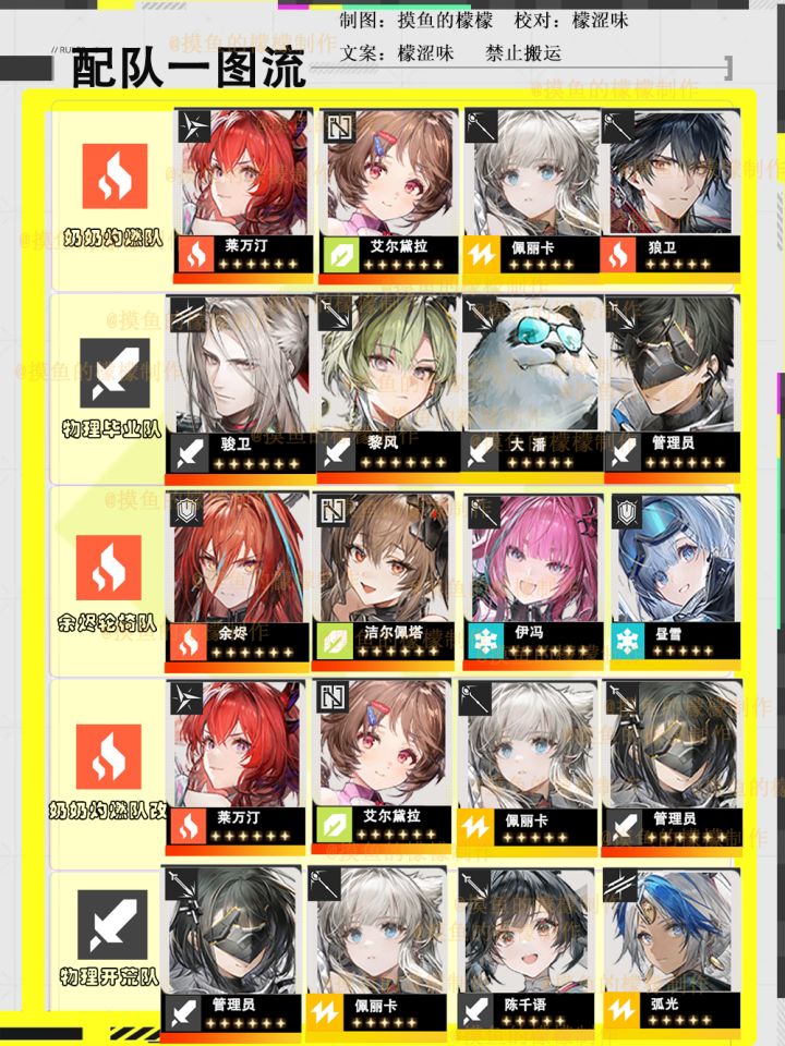 三测的角色获取难度较大~这里给一些思路,请根据自己的情况自行配队目前来说,实在凑不起就玩物理队开荒~更难民一点的,实在不行就混搭~🔸奶奶队伍的小羊签到会送~脆弱减抗万金油奶🔸最后的开荒队,可以把弧光换成大潘/慕风都可以。🔸物理队伍骏卫没有慕风可以把慕风换成小陈开荒的话骏卫体验其实还可以,大世界跑图体验不错🔸还有的是杰哥,其实比本家方舟更万金油拥有极其便的异常效果群体附着与群体肖弱她
