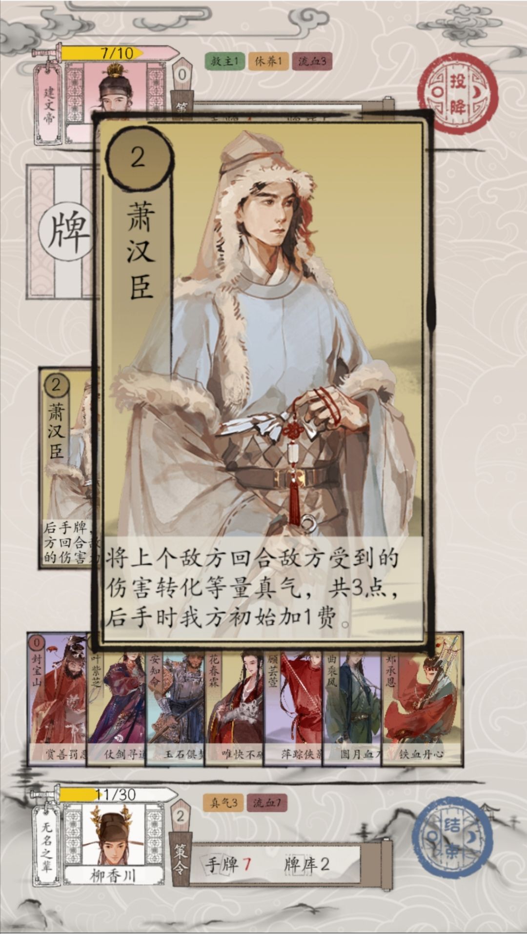 根据近日群内玩家的普遍反馈(以及对慢速环境的反感),今晚将对几个环境主导英雄做相应调整,以观成效,方便周末调整: 1、邢道先、柳香川的费用回归2费:鉴于目前防守流主导环境的情况; 2、萧定方改为固定0费:鉴于萧定方本身只能针对藩王,局限性大,但难以加强功能性; 3、曲乘风的效果改为对双方施加3点流血伤害,以补足快攻卡组和负面卡组。 修改bug: 之前上阵药郎的卡组,由于目前不能删除重复上阵的卡,所