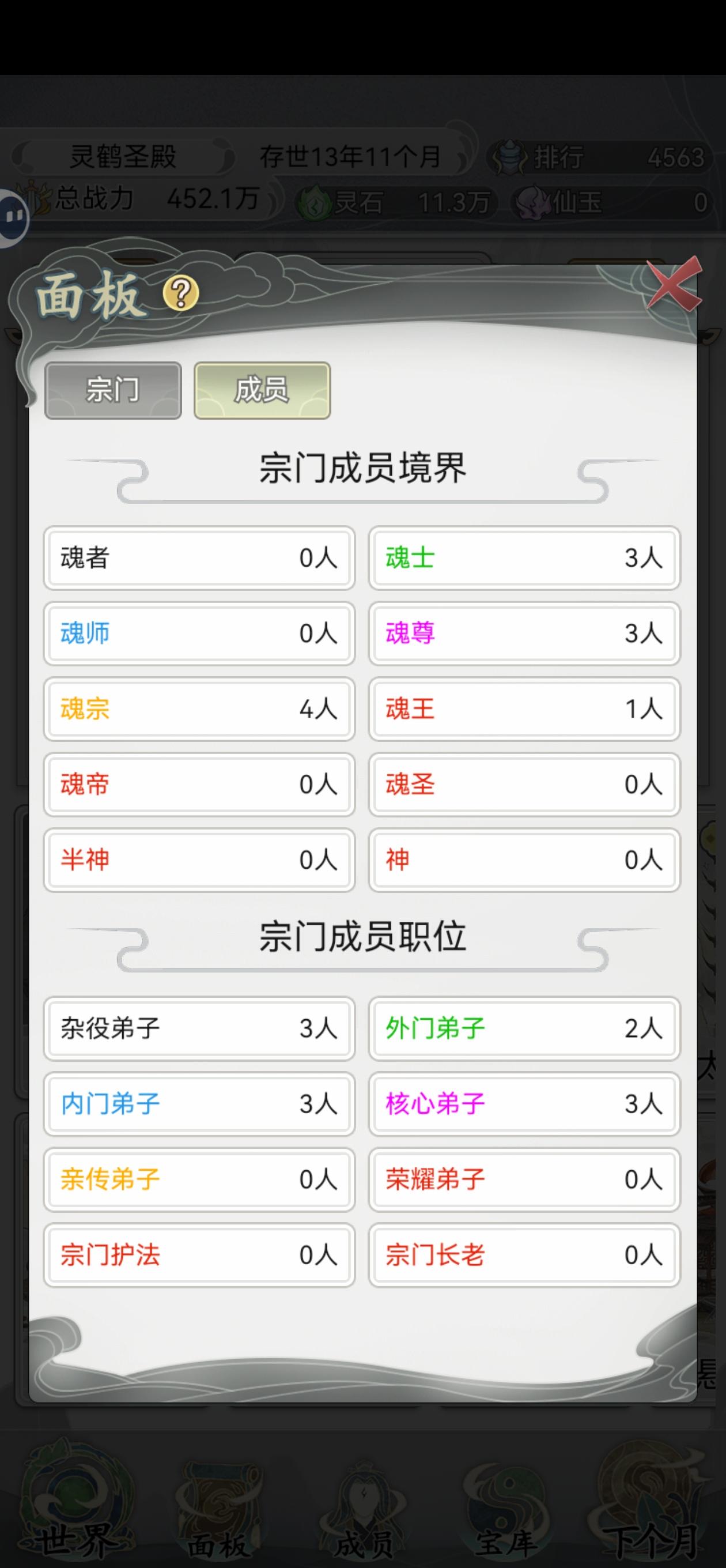 作为单机放置模拟类经营游戏还是不错的,能让人有一直玩下去的欲望,作为游戏是合格的。灵石这种基础资源获取也非常简单。文字方面非常一般,每个月的事件是非常模糊简略的,也看不了成员每月事件/经历,只能像看个大纲一样:本月支出多少收入多少,某某成员学了啥功法有了什么法宝,但一切都是非常简略,事件也非常少,成员好多长的还一样。xx宗女主修炼手札也是这类游戏,但是事件自由度触发多样方面完全能秒杀这个,最起码每个月有什么事件,你认识的人/宗门成员遇到了其他宗门成员之类的都是能看到的并且能解锁新宗门新任务,每个人物也能点进去看经历。