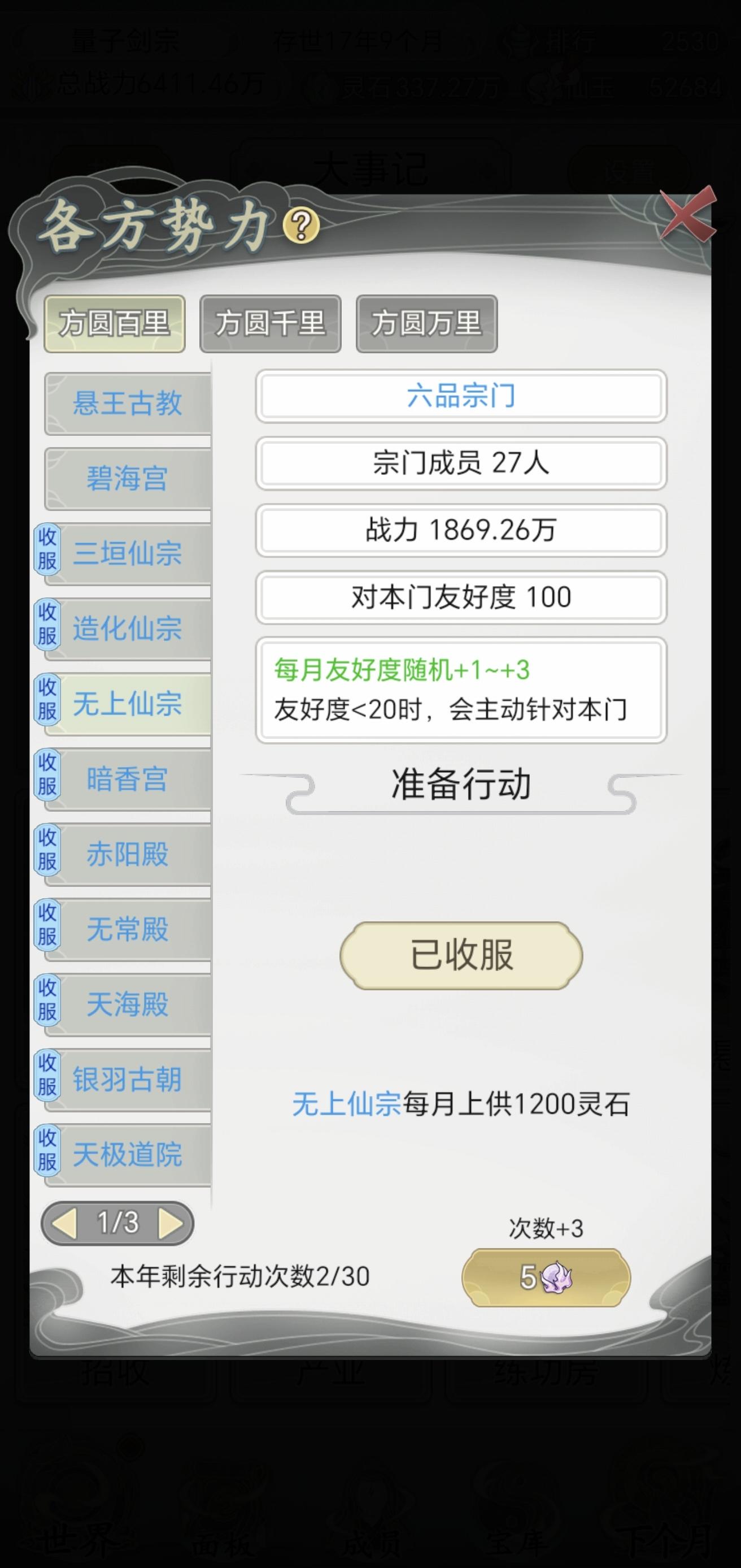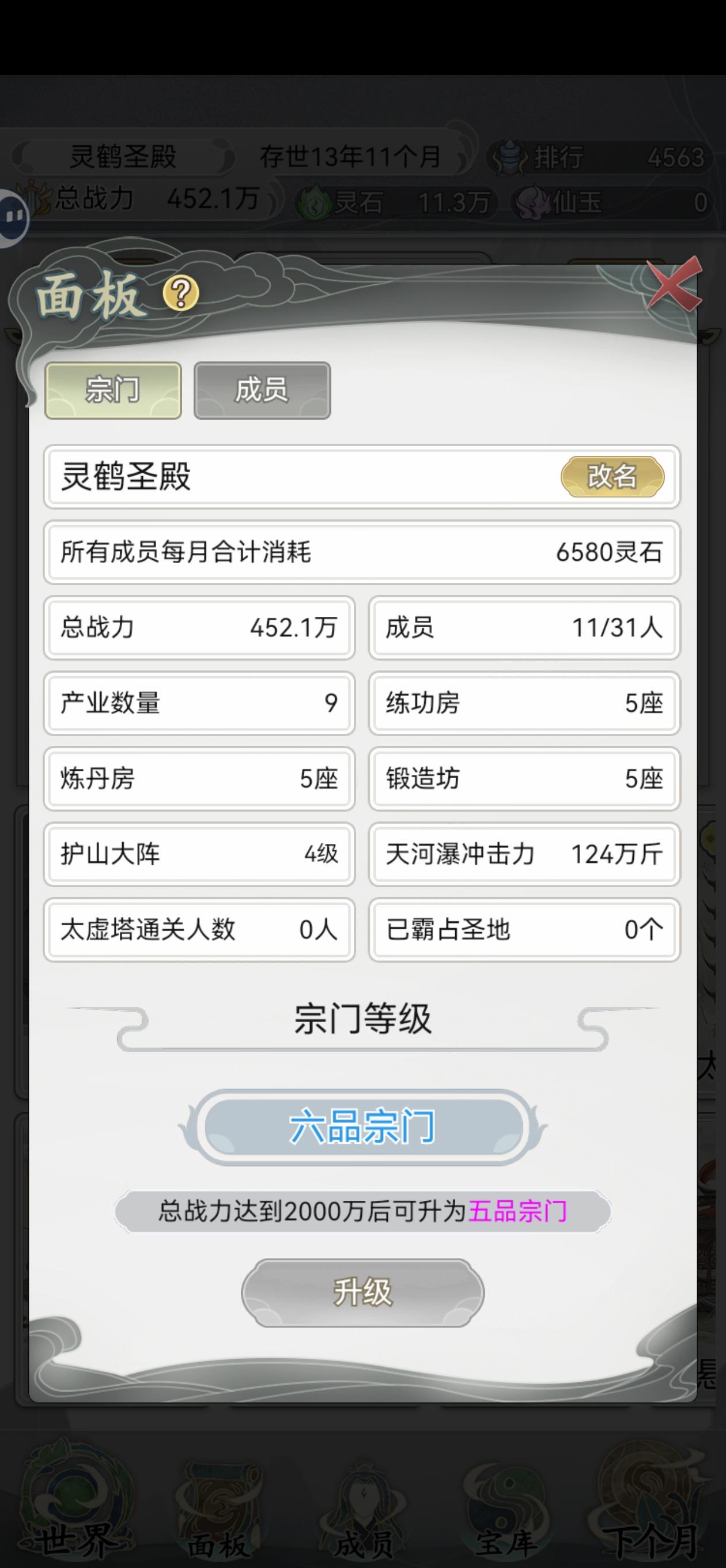 其它宗门太强大了,我们根本无法战胜…(开个玩笑),不过NPC是根据你的战力来的,哪怕你在15年内提到2000万战力也没啥用,自由度太低了,几乎一直走一条线,别说玩完一把了,玩20小时就不行了,这还是我半夜闲的没事点的