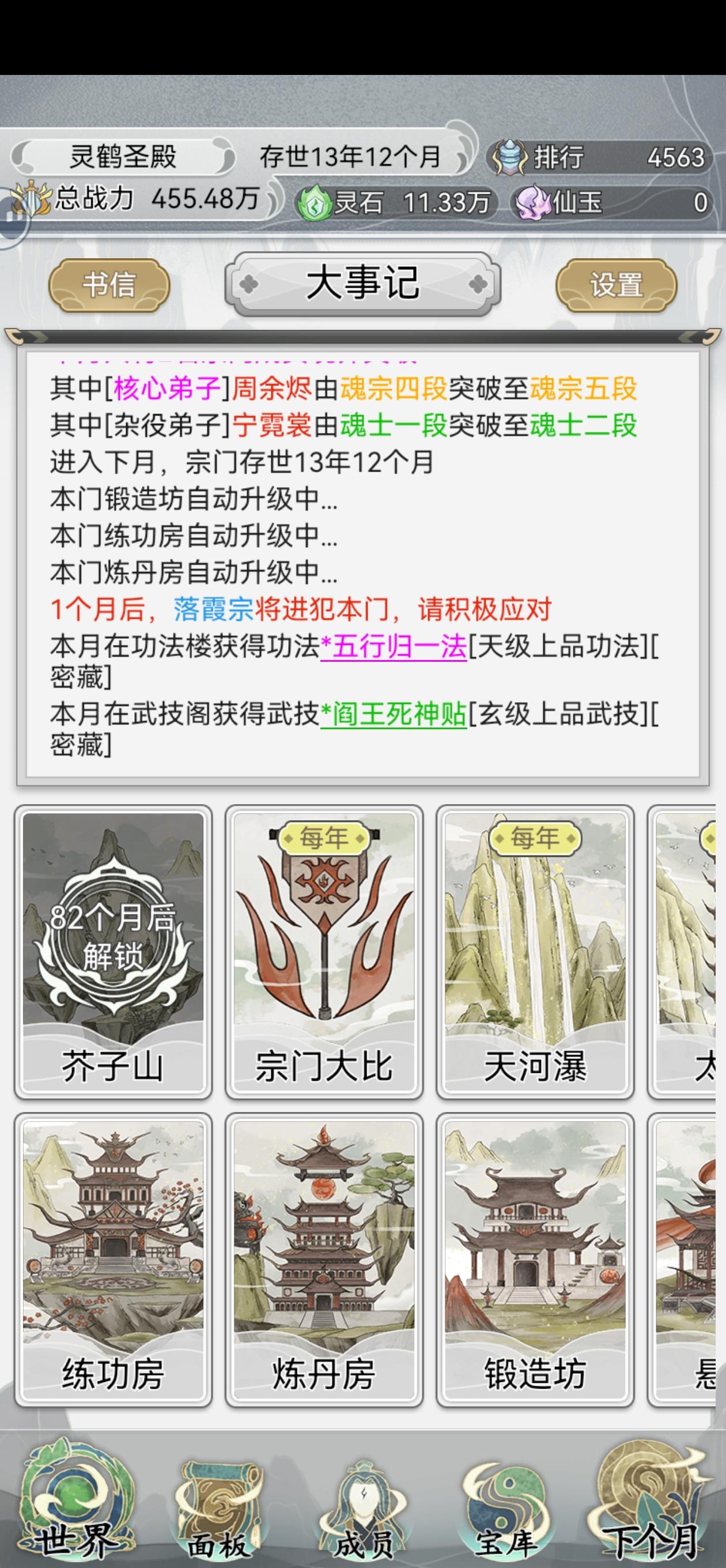 4.炼丹室之类的稀有度要保留一个梯度,不然新弟子会缺少成长点,基本上随着宗门的升级始终建最高稀有度的就可以了,不用花资源升级稀有度。