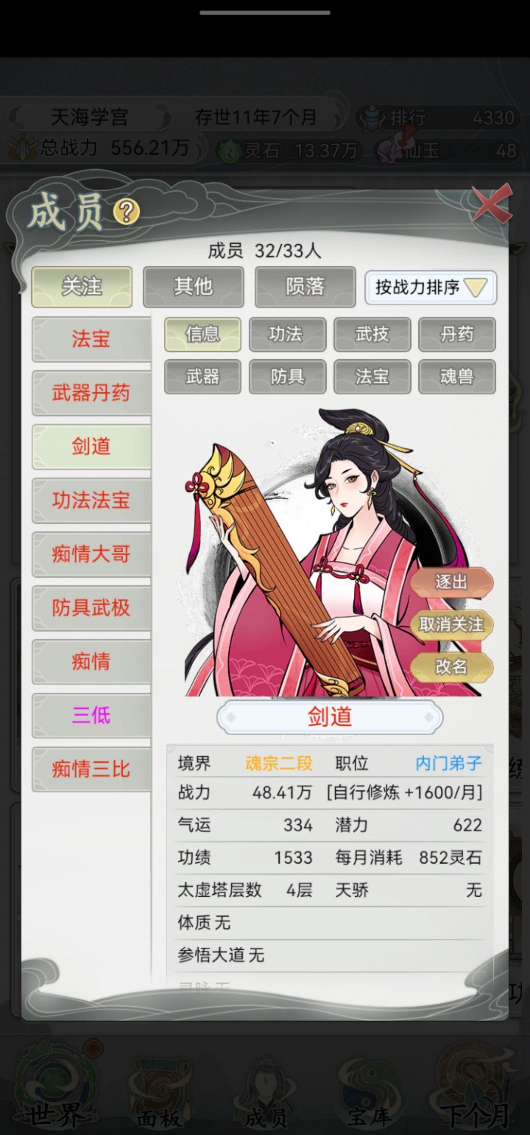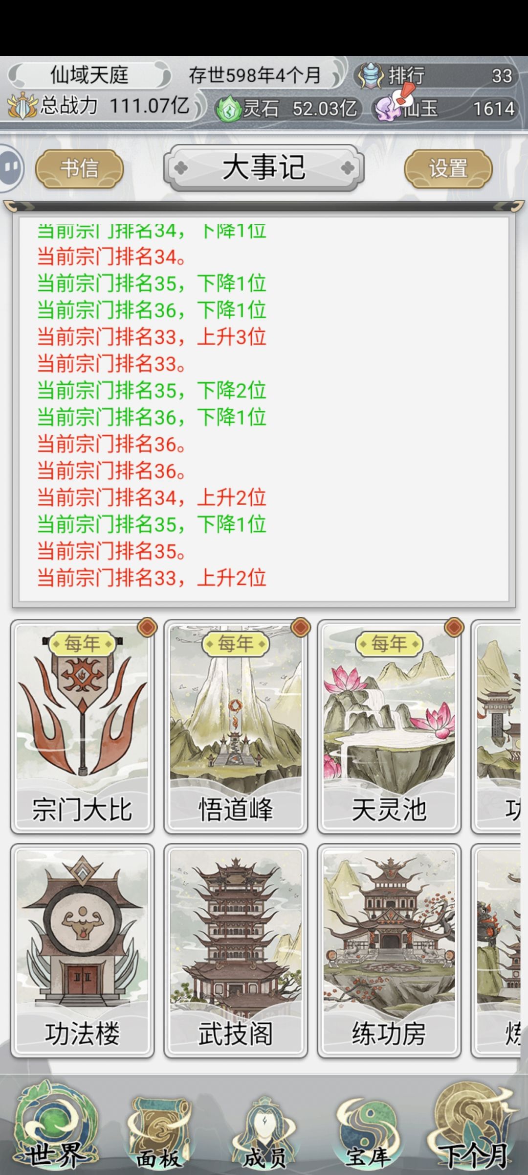 推荐战力天赋:卷王(总战力加成)绝对的T0!其他的功法、武器、防具、丹药、御兽等等…看你自己吧,我觉得差不多。 刷钱天赋:扣(减少成员支出)、背景雄厚(增加黑市收入,中期t0加钱天赋),前期可以稍微省点,或者搞几个其他天赋过度也行。 灵石花销最多的就是给成员发工资,所以扣是挺划算的,至于“背景雄厚”,黑市是收入最多的建筑,快中期就可以解锁了。其他加钱天赋的建筑物,基本很快就淘汰了,不太推荐。 功能