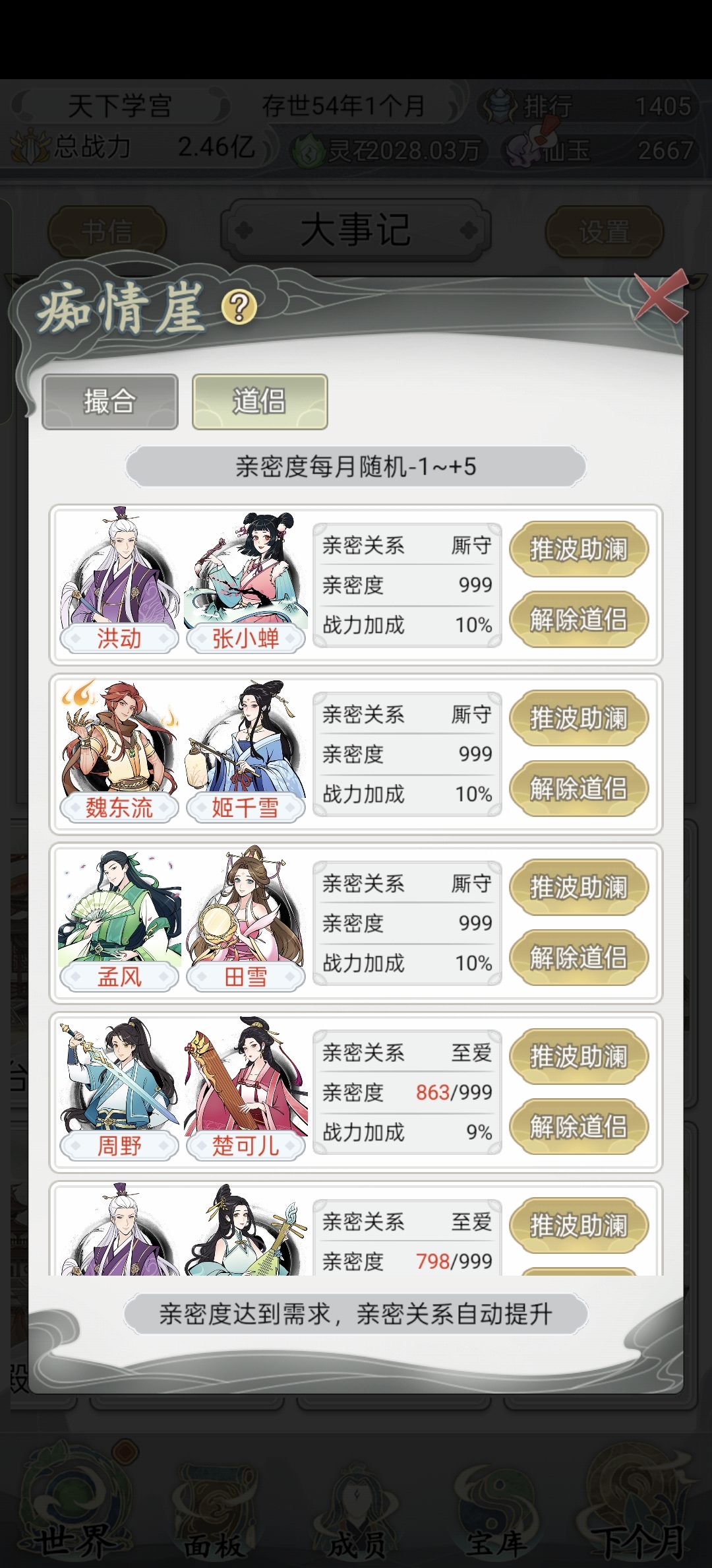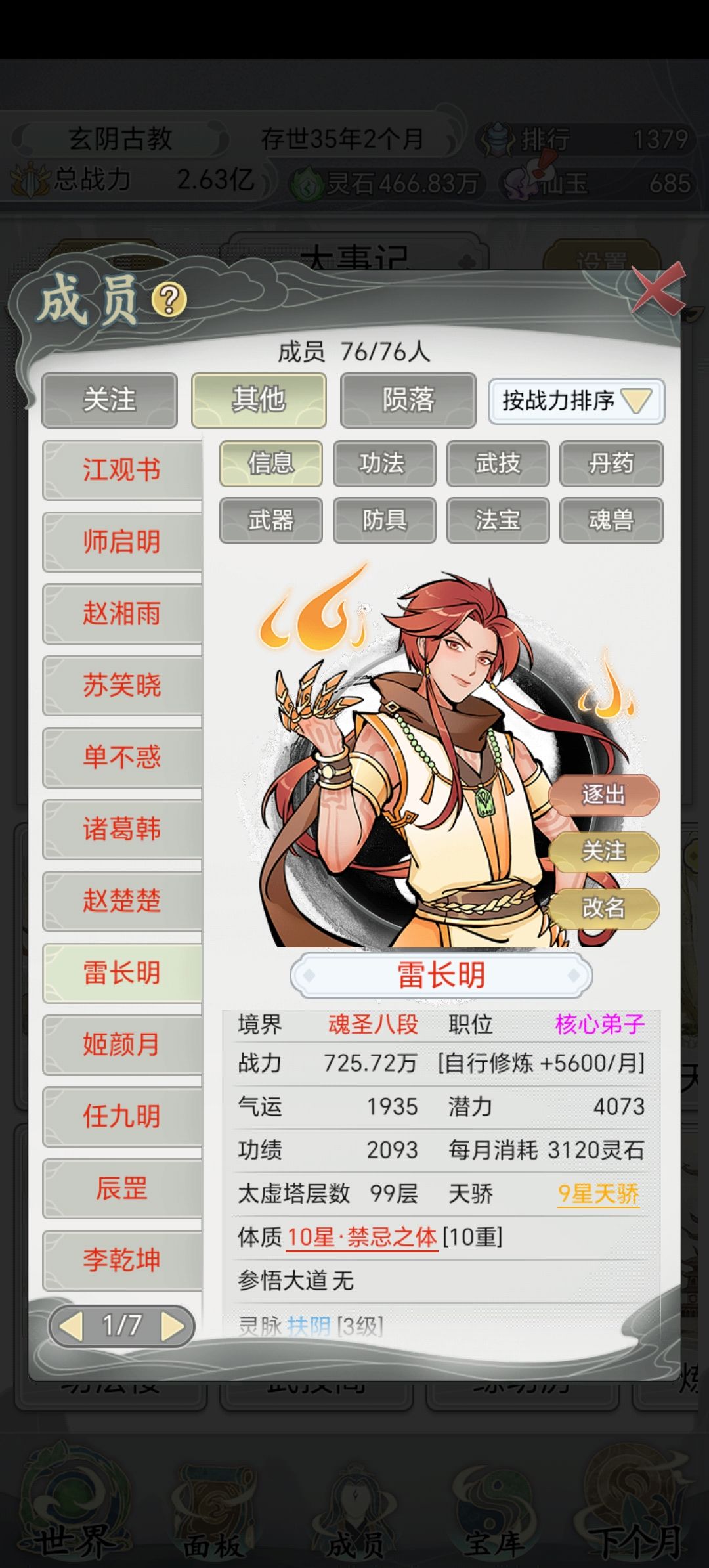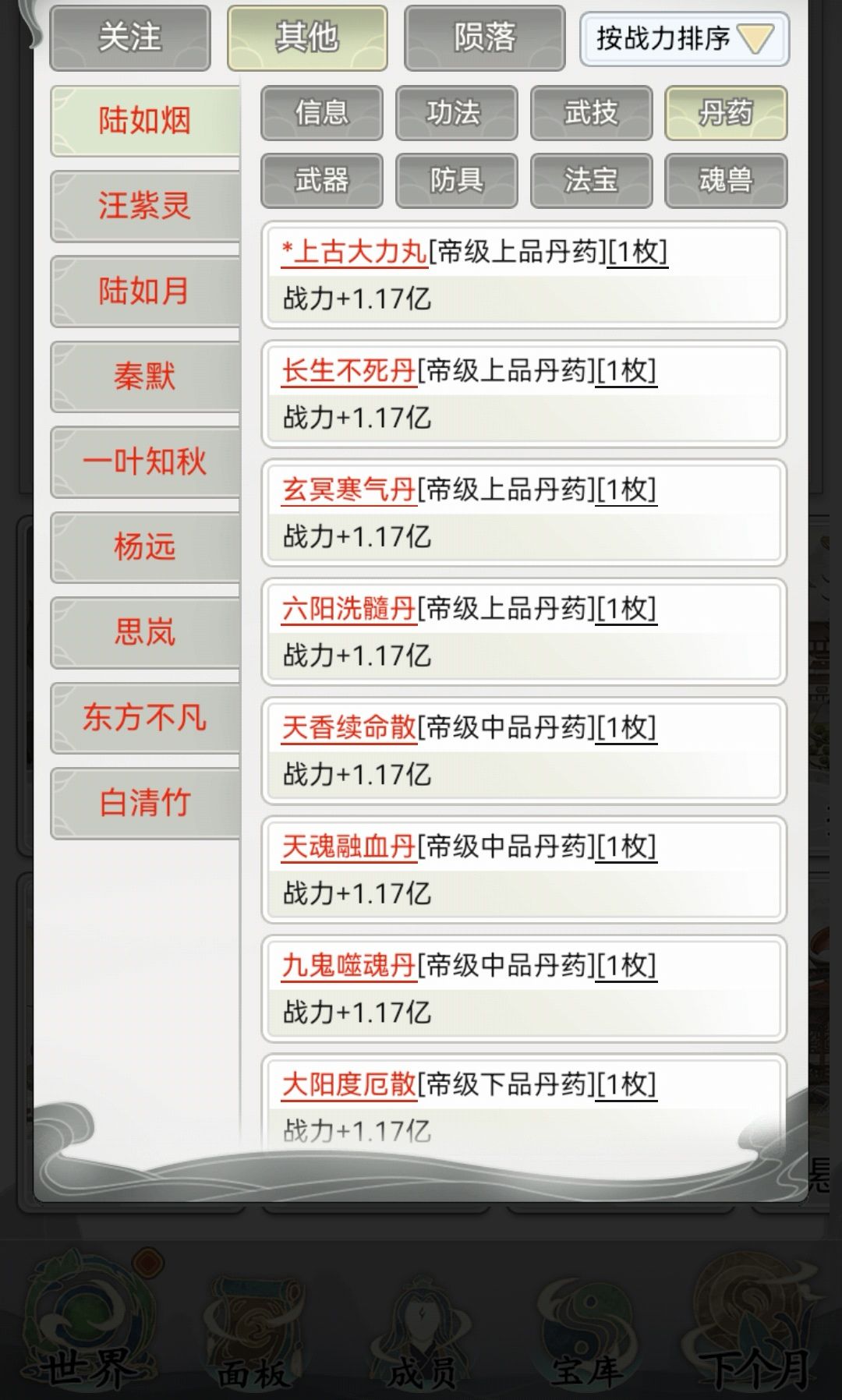 只分析硬件, T0【卷王】:总战力永久加成 T0.5【痴情】:被动总战力永久加成 【潜力股】:潜力永久加成 【莽】:每月额外主动修炼,量变 【炼体】:每次修炼额外加成,量变 因为战力提升最大的是丹药、法宝和功法, 所以这三个跻身T0.5, 【丹药精通】:丹药额外加成 【法宝精通】:法宝额外加成 【功法精通】:功法额外加成 T1:通用天赋, 【驭兽:魂兽额外增加战力】 【武技精通】【武