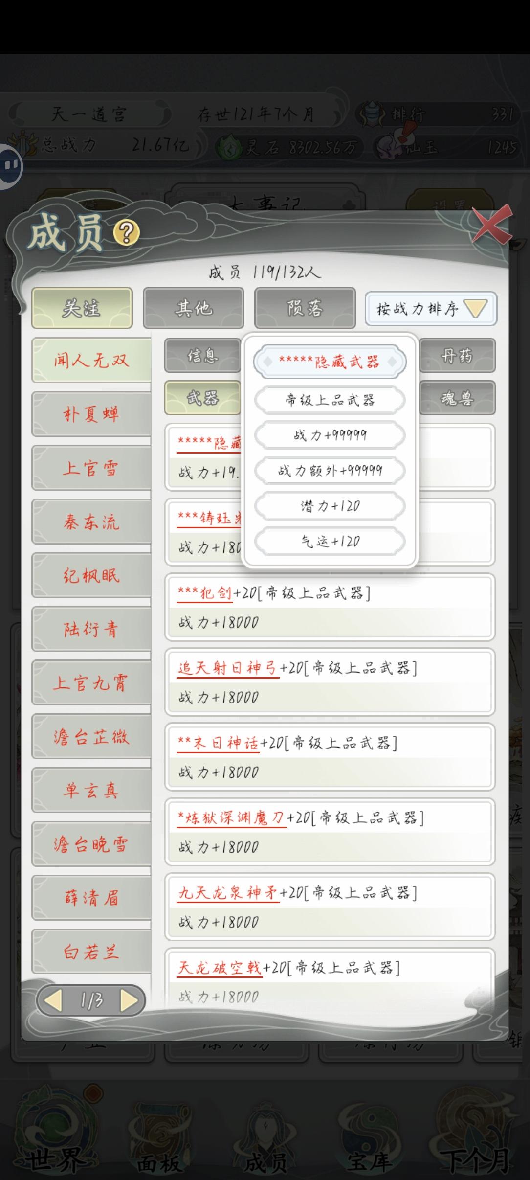 阶段:前五年,每个月都一样样全点;然后有十年开始随意点,只点重要的;二十年以后狂加速,只在每年第一个月刷新的时候点下(天河,太虚塔,灵脉,大道,道侣),然后隔五六年参加一次天骄大赛(因为短期内一直参加排名不太变化,隔段时间选战力前20的参加,收益大,平时的话我就建议随机,下面的人也能评天骄),另外灵脉我只点概率够100%的,不浪费次数 弟子:除了大师兄皮霸天,其他弟子排名每个阶段前五名都在换(一是