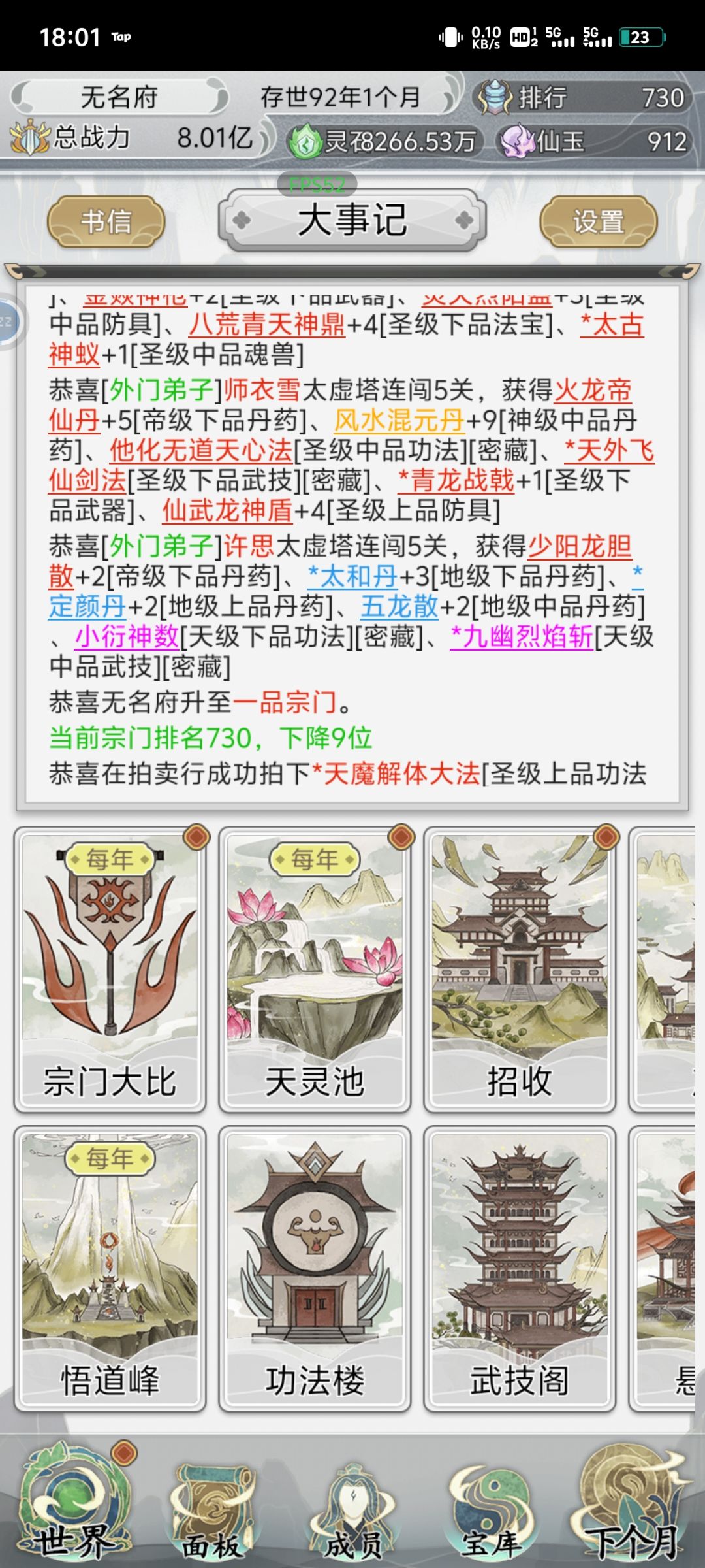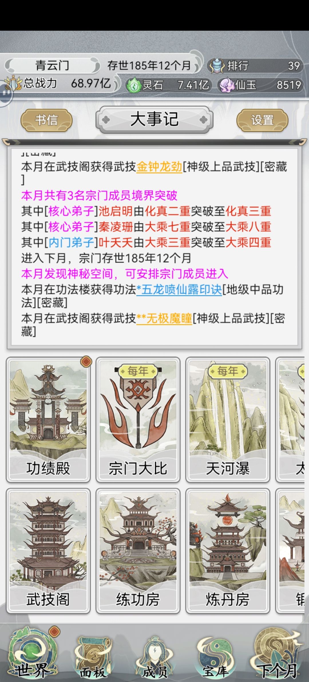 阶段:前五年,每个月都一样样全点;然后有十年开始随意点,只点重要的;二十年以后狂加速,只在每年第一个月刷新的时候点下(天河,太虚塔,灵脉,大道,道侣),然后隔五六年参加一次天骄大赛(因为短期内一直参加排名不太变化,隔段时间选战力前20的参加,收益大,平时的话我就建议随机,下面的人也能评天骄),另外灵脉我只点概率够100%的,不浪费次数 弟子:除了大师兄皮霸天,其他弟子排名每个阶段前五名都在换(一是