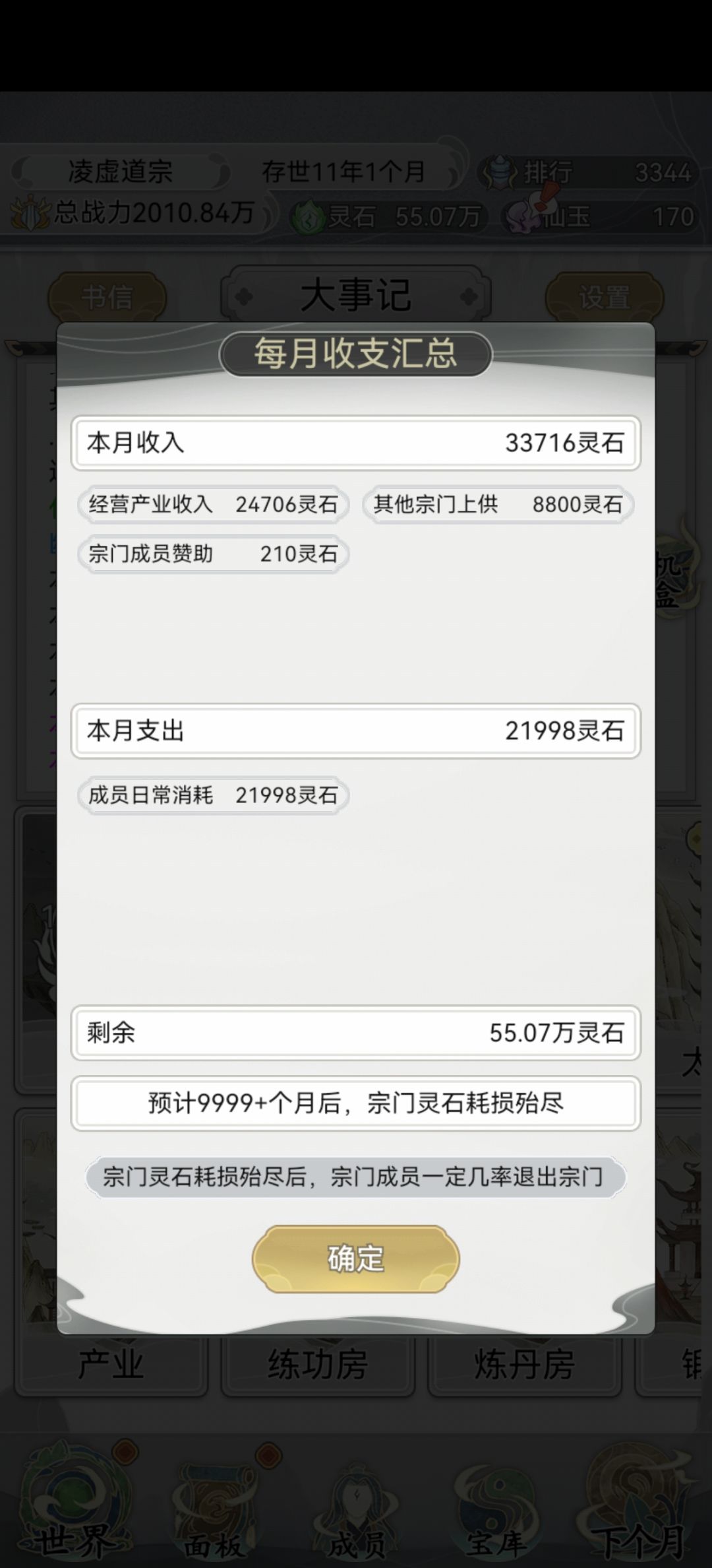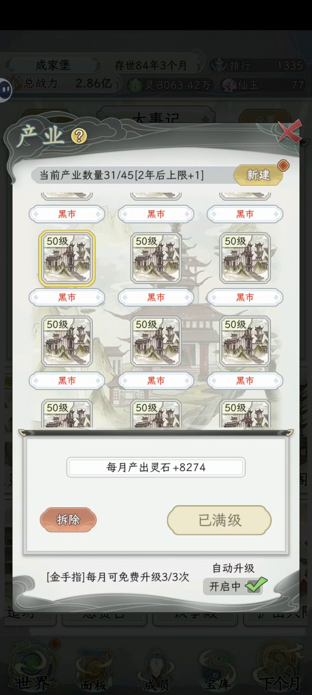 把所有产业换成黑市,然后一直点下个月一直刷黑市等级,等把黑市等级全部升到50级,能够实现每天灵石收益大于支出灵石,这样灵石就会越用越多,不用担心灵石用完了[表情_吐舌头][表情_大笑]#发现好游戏 #不一样的修仙宗门2