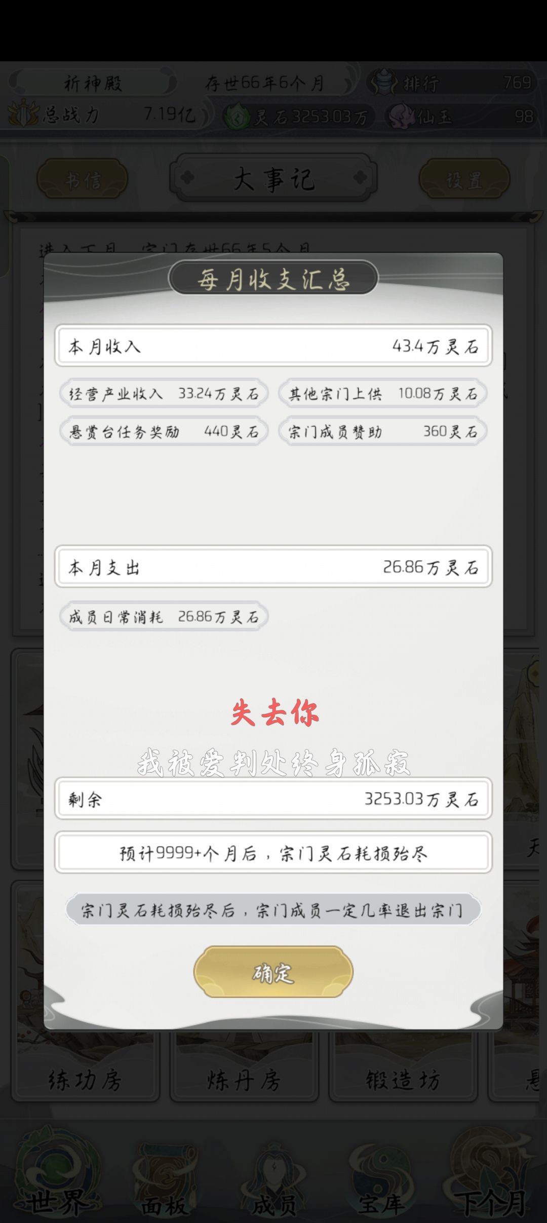 本来想做到顶级宗门,然后再来评论,现在发现没那个必要了,先吐槽一下作者还会不会更新,我觉得应该不会更新去做别的游戏了吧,但是听我一句劝,别做,你一个文字游戏都做不清楚,游戏内很多不足且没用的东西 《没用》 议事殿(这东西从头到尾根本没用) 悬赏台(这玩意根本不用去刷新它,自动让它更新自己做就行了,而且也没什么奖励) 炼丹房,锻造坊(这俩玩意是干什么用的作者能跟我说一下吗?也就练功坊有点用) 护山大