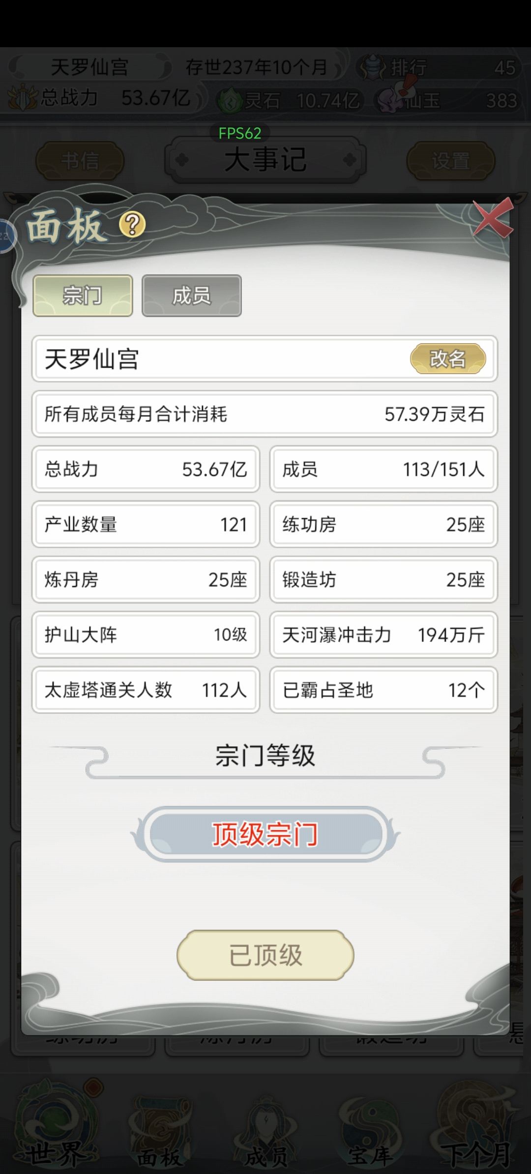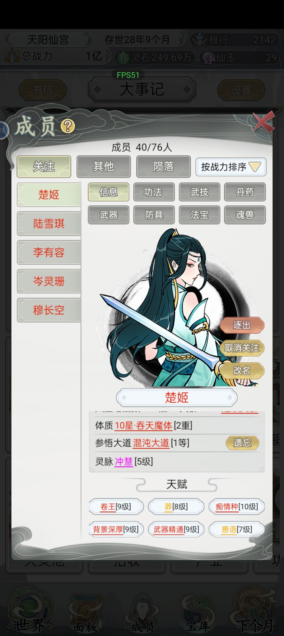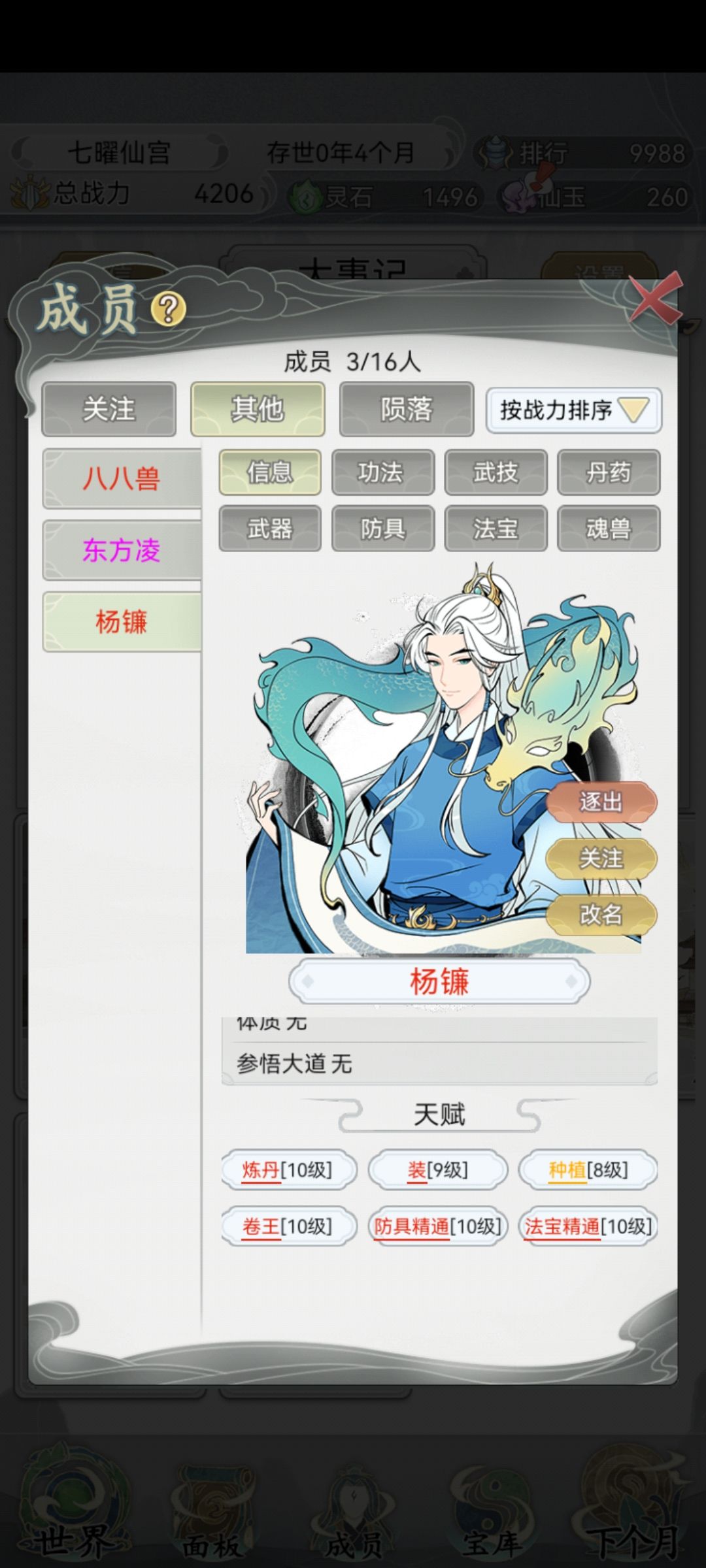 不敢说理解,我刚玩这游戏,刚度过中期升到三品。 首先秀一下我家首席大弟子,刷了百多次才刷出来的,成长过程也是集千般宠爱,倾全宗门之力。 先萌新向普及一下基础 1.关于人物属性 境界:战力高低的体现,反之强行提升战力也能快速拉升境界(如给新入门弟子帝级功法、武器、法器等能短时间提升其境界)。 职位:职位越高访问功法楼、武技阁的层数越高;同时对练功房、炼丹房、锻造坊具有优先选择权。 战力:这游戏目标就
