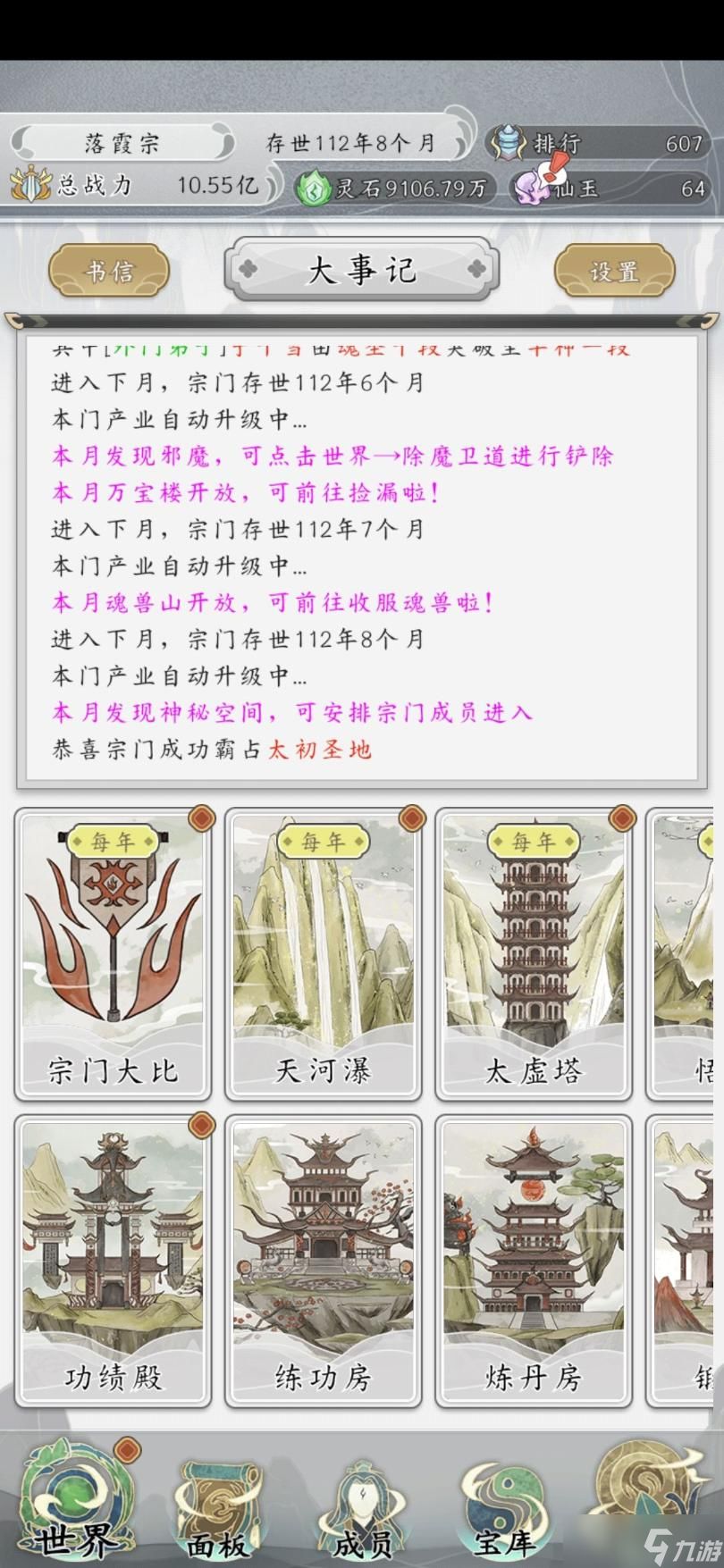 总结一些其他帖子很少(我没说没有)有人说的: 1. 除魔卫道: 你家老大的潜力>2000(2000+后对于修炼速度的增加就没啥感觉了)后,除魔的安排就按照战力倒序排列,然后派弟子一波一波的刷潜力就完事了。最高2.多的陨落率,随便赌。 2.功绩殿: 一定要保证每个阶段的弟子最少4位,不然就没法开宗门大比,就没法获取功绩了!虽然有武道大会,但是拿过第一后就不让参加了。而悬赏的功绩少的离谱,你的弟子就很