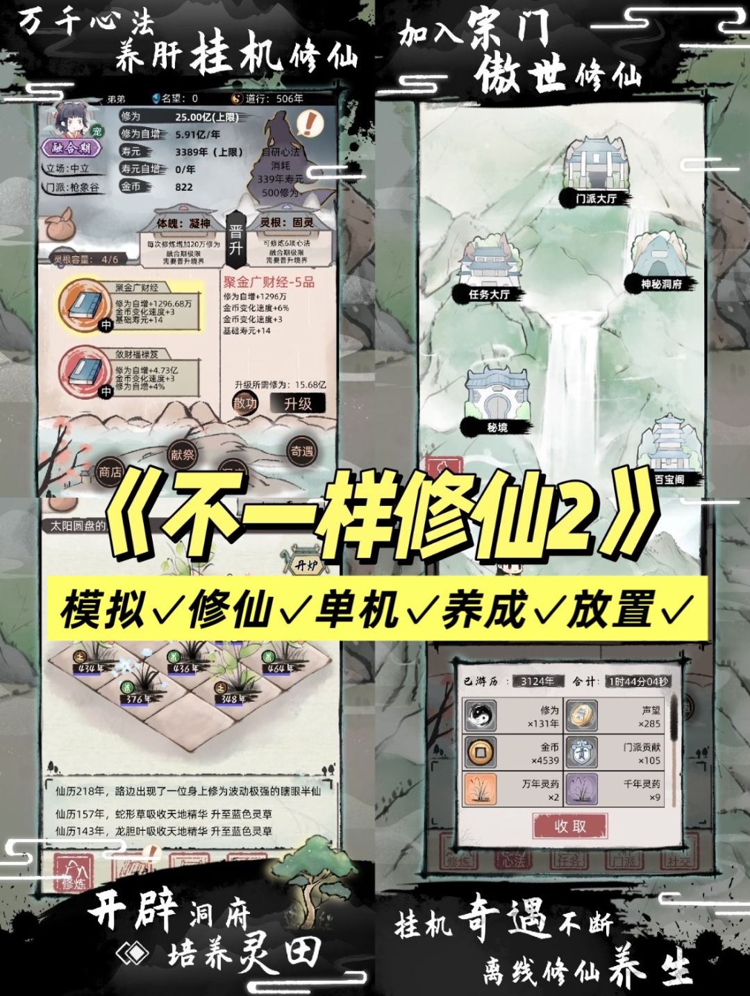 开始选16人,能多一个是一个 招收:收弟子的地方,刷弟子啥的太累了,随缘吧,个人推荐红色加灵石💰类型弟子,战力随着时间会增加,同样消耗也会增加,所以不想勒紧裤腰带就加钱吧 锻造,炼丹,练功,三个辅助建筑,都是给弟子使用,锻造,炼丹,是有几率的,69%的几率,但是,炼丹出来的丹药是可以叠加的,所以我不选择开锻造屋 悬赏台,发布任务给弟子,奖励无序,基础的就是灵石,所以也是不推荐 议事殿,和悬赏台类似