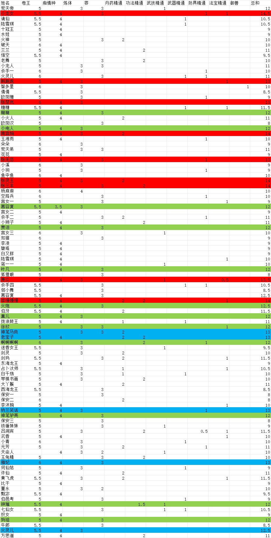 玩了快一个月了,突然发现大神们的好多攻略,今天在单位摸鱼做了个表,开除了一大批小菜鸟,把凑合用的都就下了,战力减少快2亿,哈哈哈,厚积薄发我把卷王9级的给了5.5分,10级的6分,因为这个技能实在太强了,8级和以下的给了5分,人物里最低是5级卷王,再低没发用了,其他评分参考500年大神和其他帖子,哈哈哈